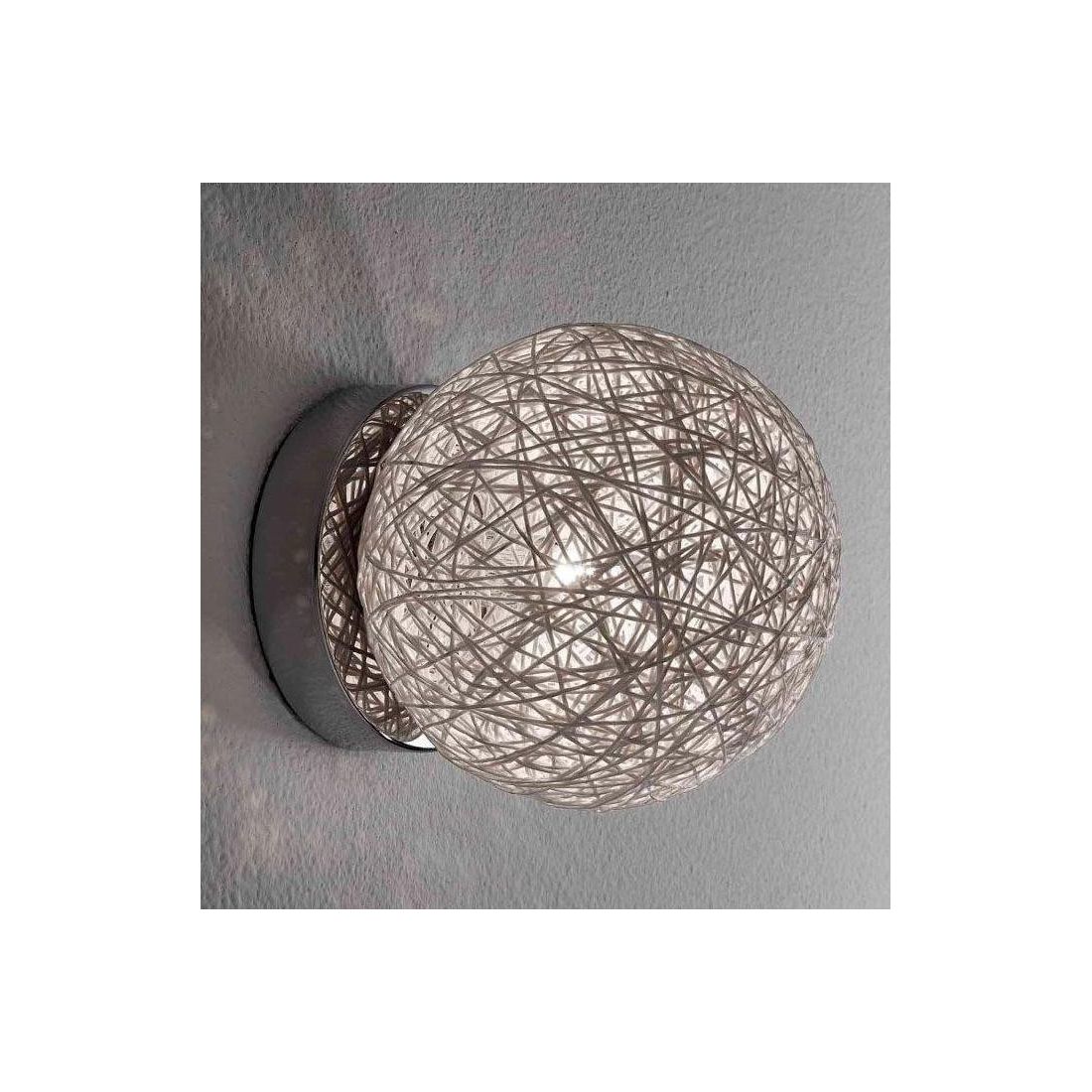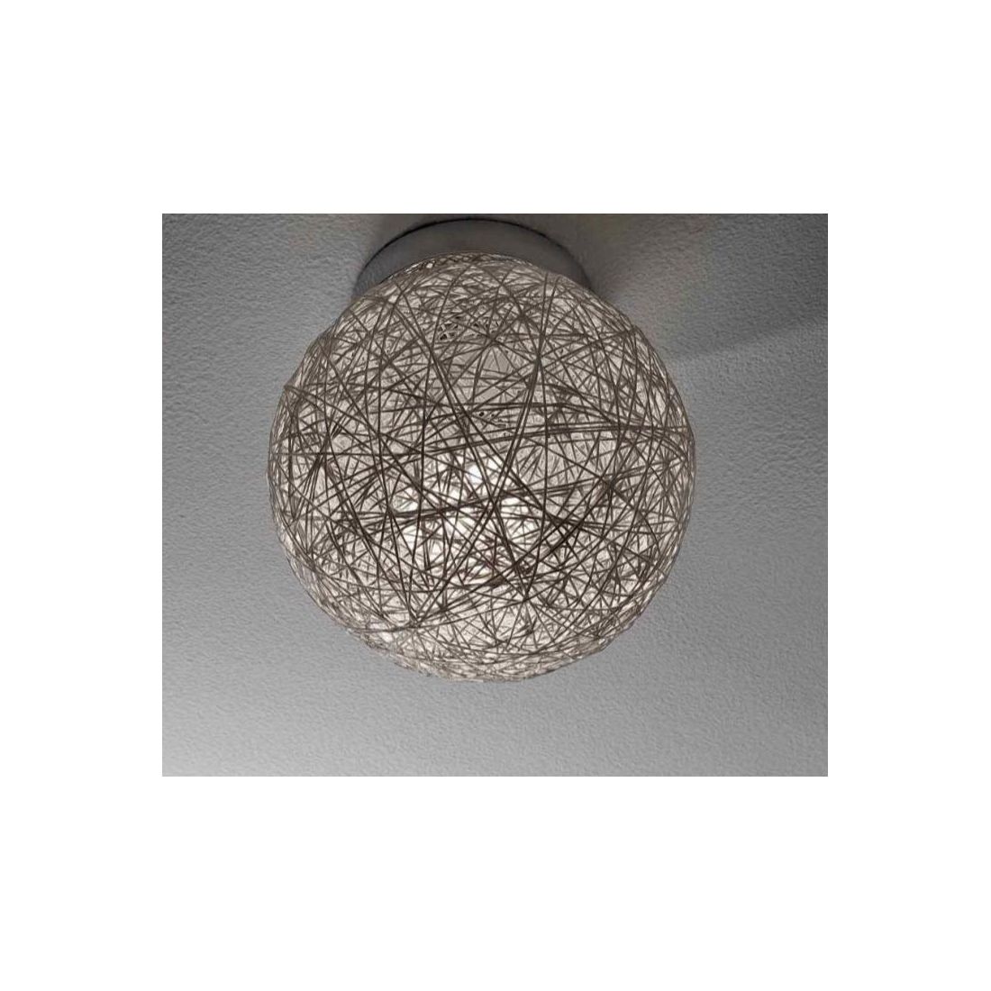 Plafoniera media della famiglia, dal design moderno, molto particolare, composto da una struttura a soffitto di forma rotonda prodotta in metallo Cromato e dal diffusore realizzato in corda bianca incollata che diffonde la luce in tutta la stanza.