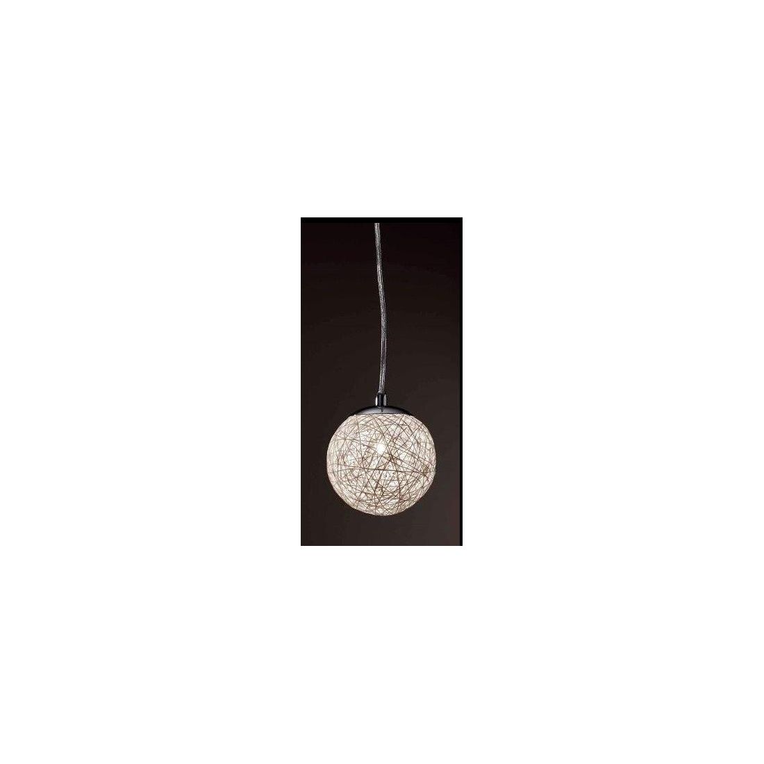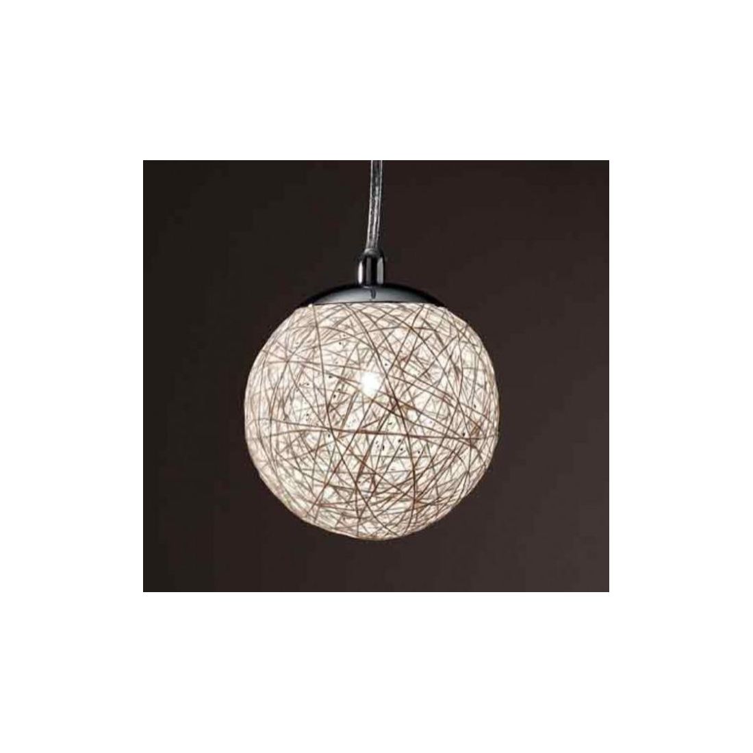 Sospensione dal design moderno, molto particolare, composto da una base a soffitto di forma rotonda e base sopra sfera prodotte in metallo Cromato e dal diffusore realizzato in corda bianca incollata che diffonde la luce in tutta la stanza; cavo elettrico in silicone trasparente della lunghezza di cm 130 regolabile in altezza.