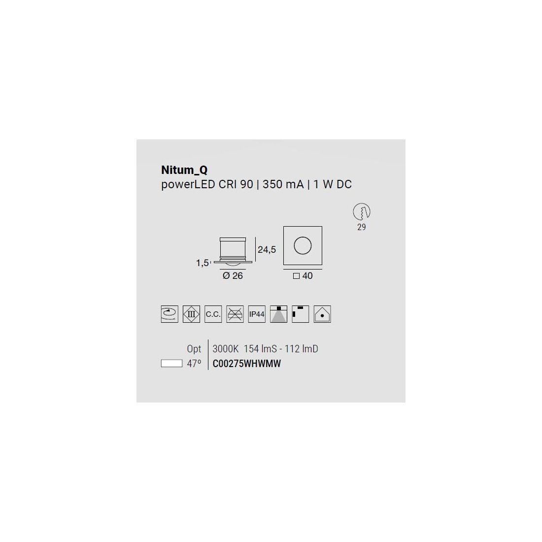 Ha una sorgente luminosa Led di colore bianco caldo 3000 K ed un CRI 90; il flusso luminoso della sorgente è di 154 lm, con un'efficienza nominale di 154.0 lm/W. La potenza assorbita dall'apparecchio è di 1 W, il cavo per l'alimentazione è incluso e presenta una lunghezza di 0.12 m. L'apparecchio presenta una classe di isolamento III ed è installabile a parete o soffitto.