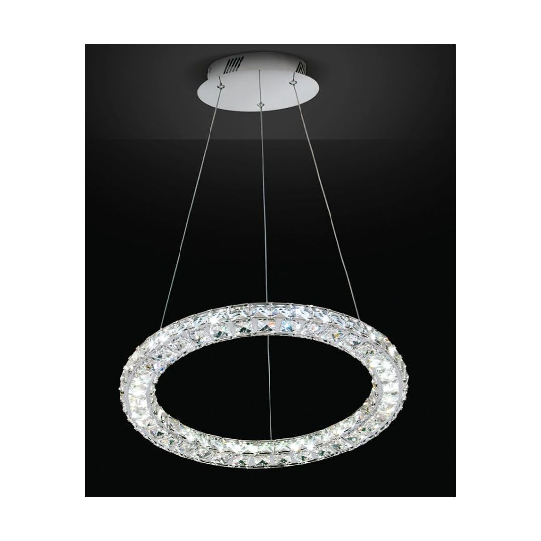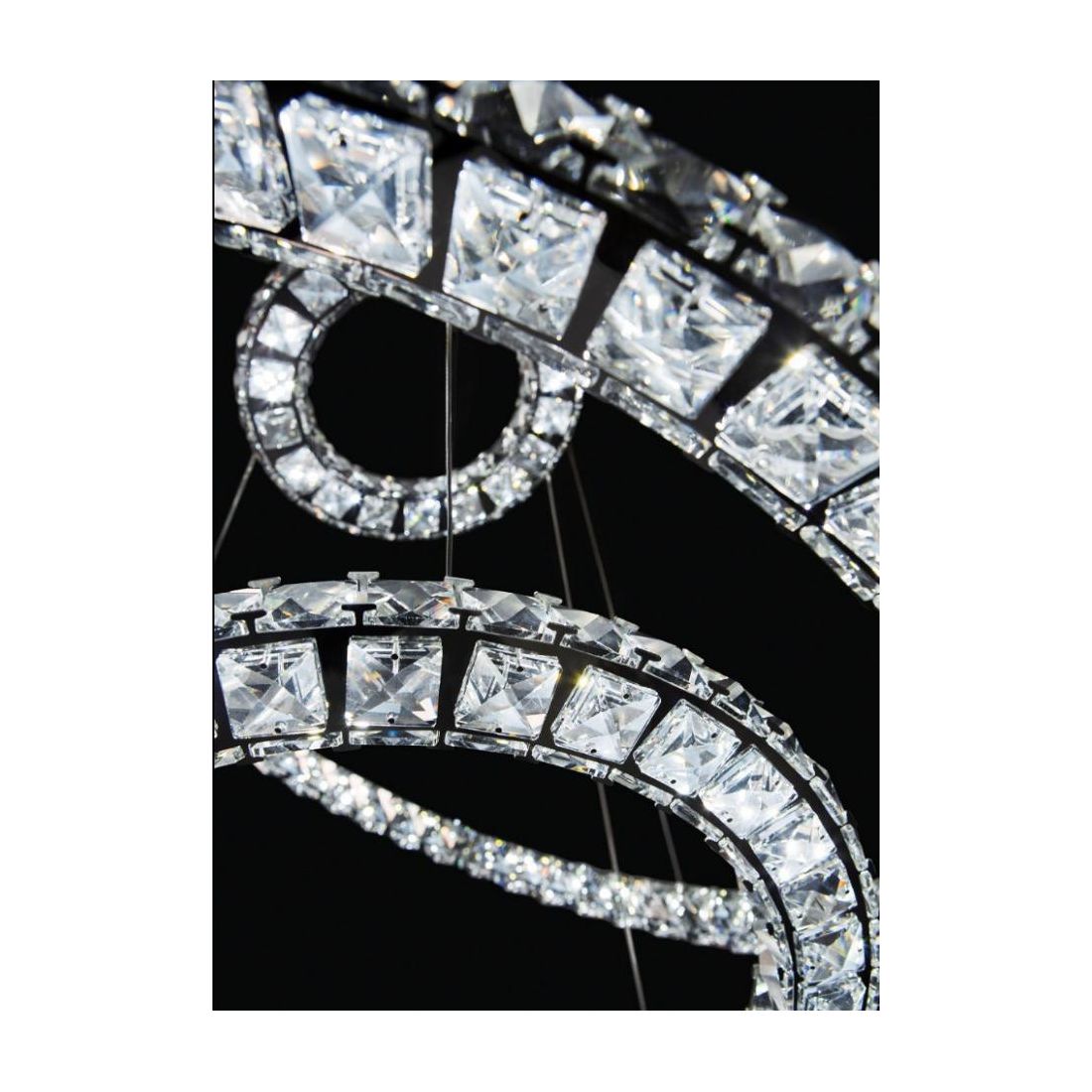 La struttura è in acciao inox con finitura a specchio con incastonate mattonelle in cristallo. I cavetti di tutti i modelli in questa serie sono regolabili singolarmente, in modo da posizionare gli elementi in altezza ed inclinazione desiderati. Uno dei cavetti è coassiale ed alimenta i moduli LED.