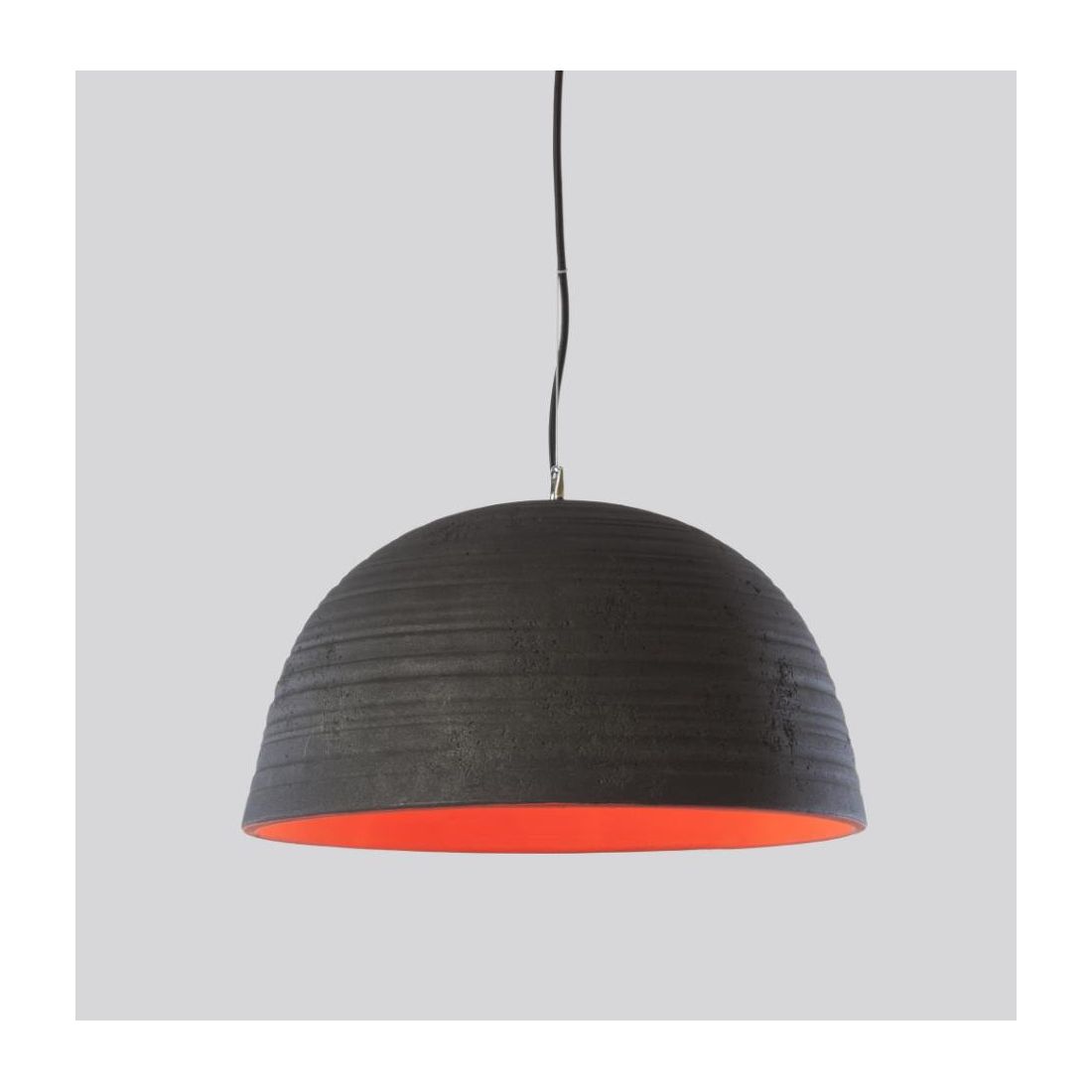 Lampadario a sospensione dallo stile rustico che si presenta con il diffusore a campana, del diametro di cm 42, realizzato interamente in ceramica, lavorata in Italia, verniciata esternamente nel colore Piombo ed internamente nel colore Arancio; è dotato di cavetto in acciaio regolabile in lunghezza in modo da regolare l'altezza del punto luce come più vi necessita.