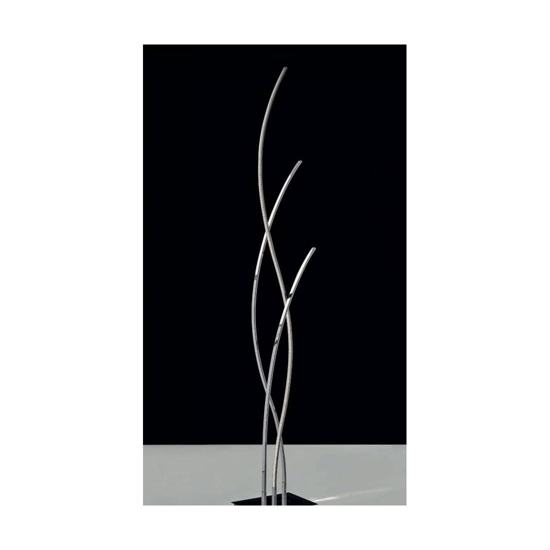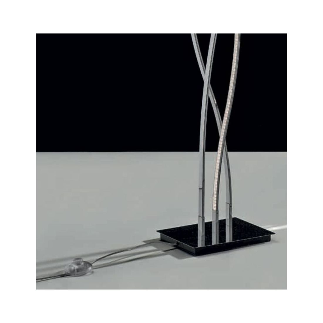 Lampada da terra Onda in metallo cromo lucido e diffusore in acrilico effetto cristallo. Le tre stecche intrecciate tra loro si illuminano per tutta la sua lunghezza. Con base rettangolare le due stecche più basse illuminano in una direzione e quella più alta in direzione opposta.