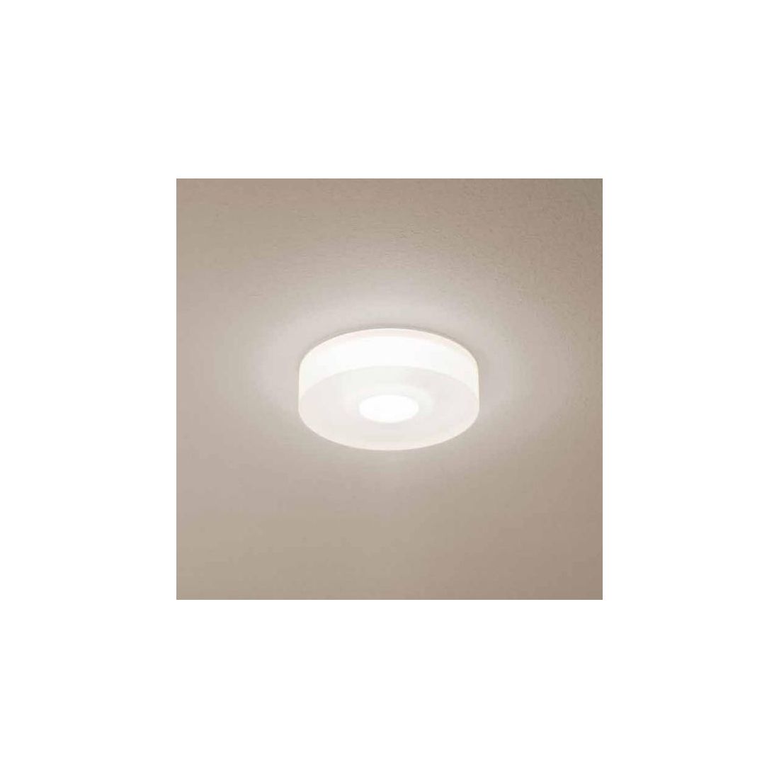 Piccola plafoniera a singola emissione con la sorgente luminosa LED da 10w, di colore bianco caldo, con distribuzione luminosa Flood, è composta da 1 LED topled, con una CCT 3000 K ed un CRI 90; il flusso luminoso della sorgente è di 1162 lm, con un'efficienza nominale di 116.2 lm/W.