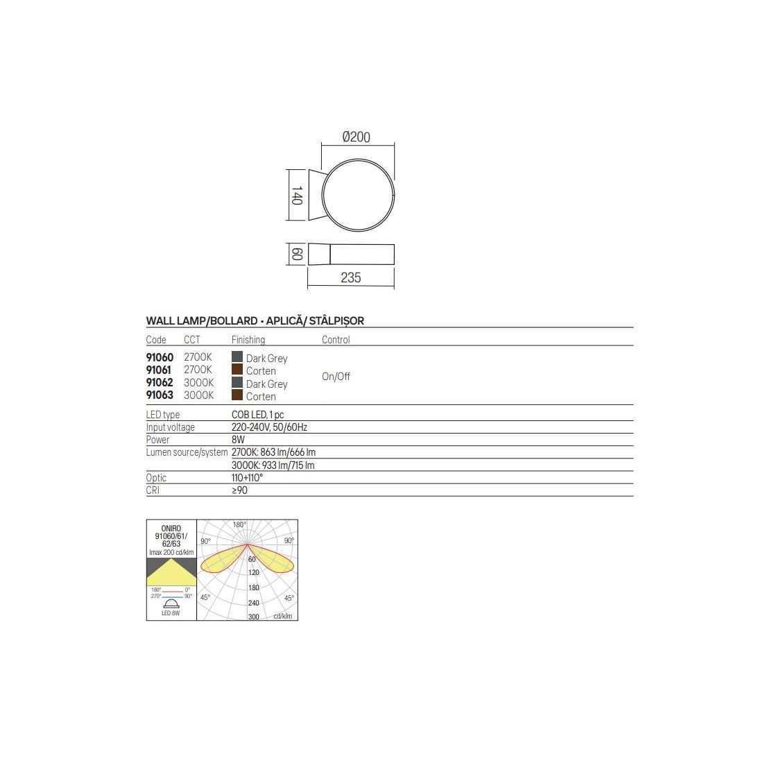 Oniro integra una sorgente luminosa a Led da 9w e, per consentire una perfetta armonia con l'ambiente circostante, è possibile optare per due diverse temperature colore: una luce calda 2700K, ideale per un'illuminazione intima, molto accogliente e rilassante, tipica degli ambienti serali oppure una luce bianca calda 3000K, perfetta per un'illuminazione più chiara e confortevole che mantiene un tono caldo ma offre una maggiore definizione visiva.