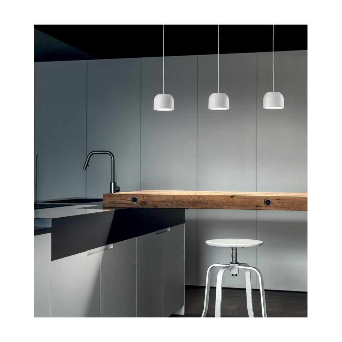 Sospensione singola, dal design moderno, che si presenta con la struttura interamente realizzata in alluminio con una finitura Bianco raggrinzante e con il diffusore in vetro trasparente che accoglie una sorgente luminosa a Led che offre una luce brillante e ben distribuita.