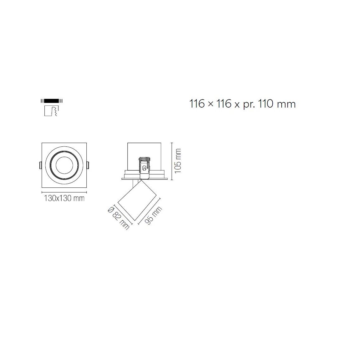 - Faretto ad 1 luce: misure cm 13x13 - altezza cm 10.5 - diametro faretto cm 8.2 - misure foro cm 11.6x11.6x pr. 11;