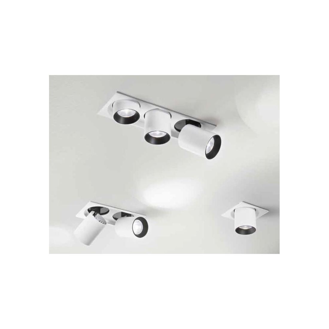 Faretto Led da incasso, con singola, doppia o tripla ottica rotonda estraibile e orientabile con una rotazione di 350°; con un design moderno e dalle linee nette ben definite che una volta installato conferirà carattere agli interni. Viene realizzato in alluminio con finitura in Bianco opaco e una bordatura interna Nera, disponibile in tre diverse misure, da scegliere in fase d'ordine.