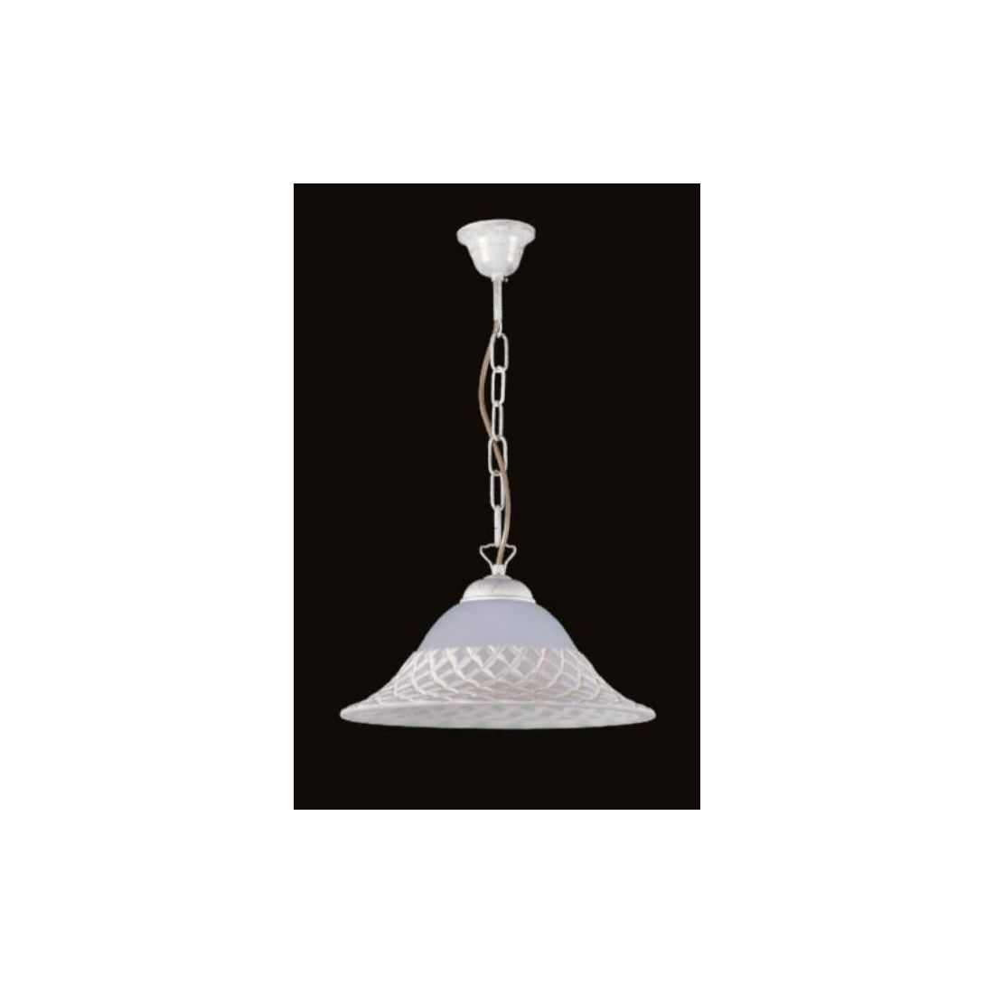 Sospensione singola, con diametro di cm 45, dallo stile classico, che si presenta con struttura e catena realizzati in metallo verniciato Bianco patinato argento e con il diffusore realizzato in vetro alabastro con incisioni decorate a rombi sulla superficie.