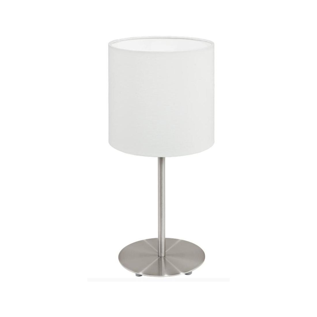 Lampada da tavolo che si presenta con una struttura in metallo con finitura Acciaio satinato e con il paralume realizzato in plastica bianca rivestito in tessuto sempre di colore Bianco.