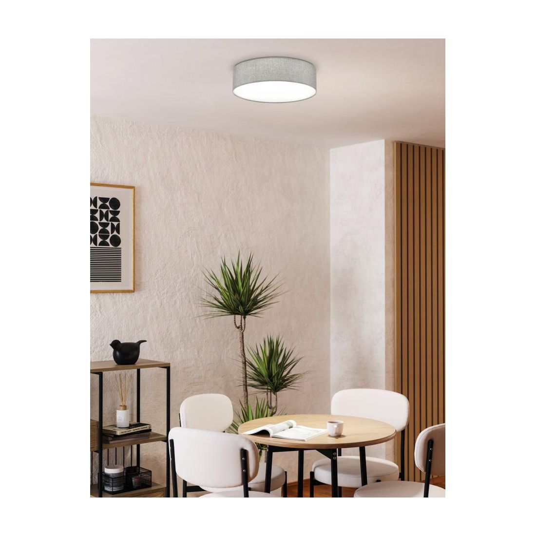 Plafoniera dal design moderno che si presenta con una struttura realizzata in metallo e policarbonato e con il diffusore rivestito esternamente in tessuto di lino disponibile in tre diverse colorazioni: Bianco, Tortora e Grigio. Questa combinazione di materiali conferisce al corpo illuminante un aspetto sobrio ed elegante rendendolo un complemento d'arredo di spicco.