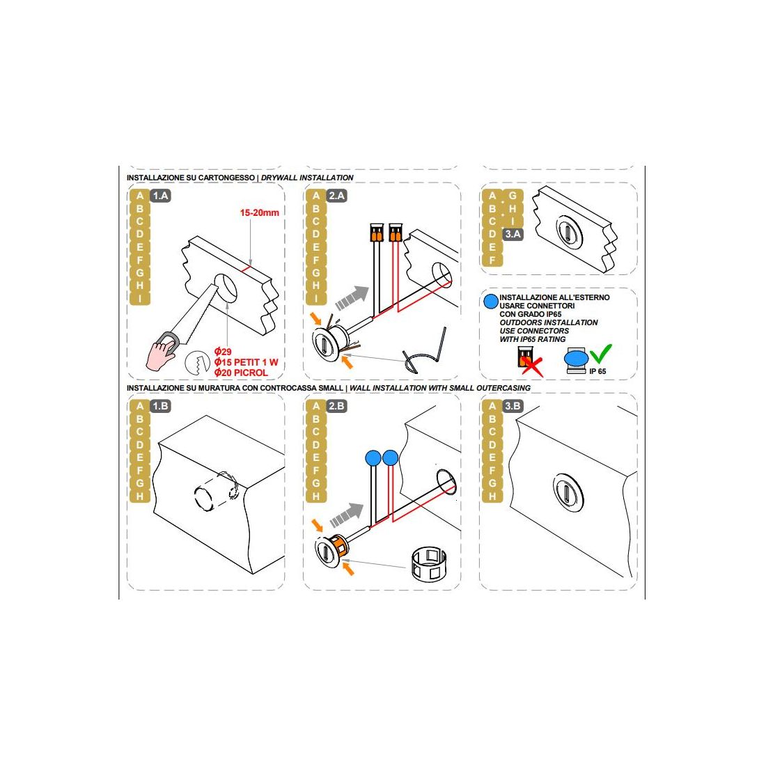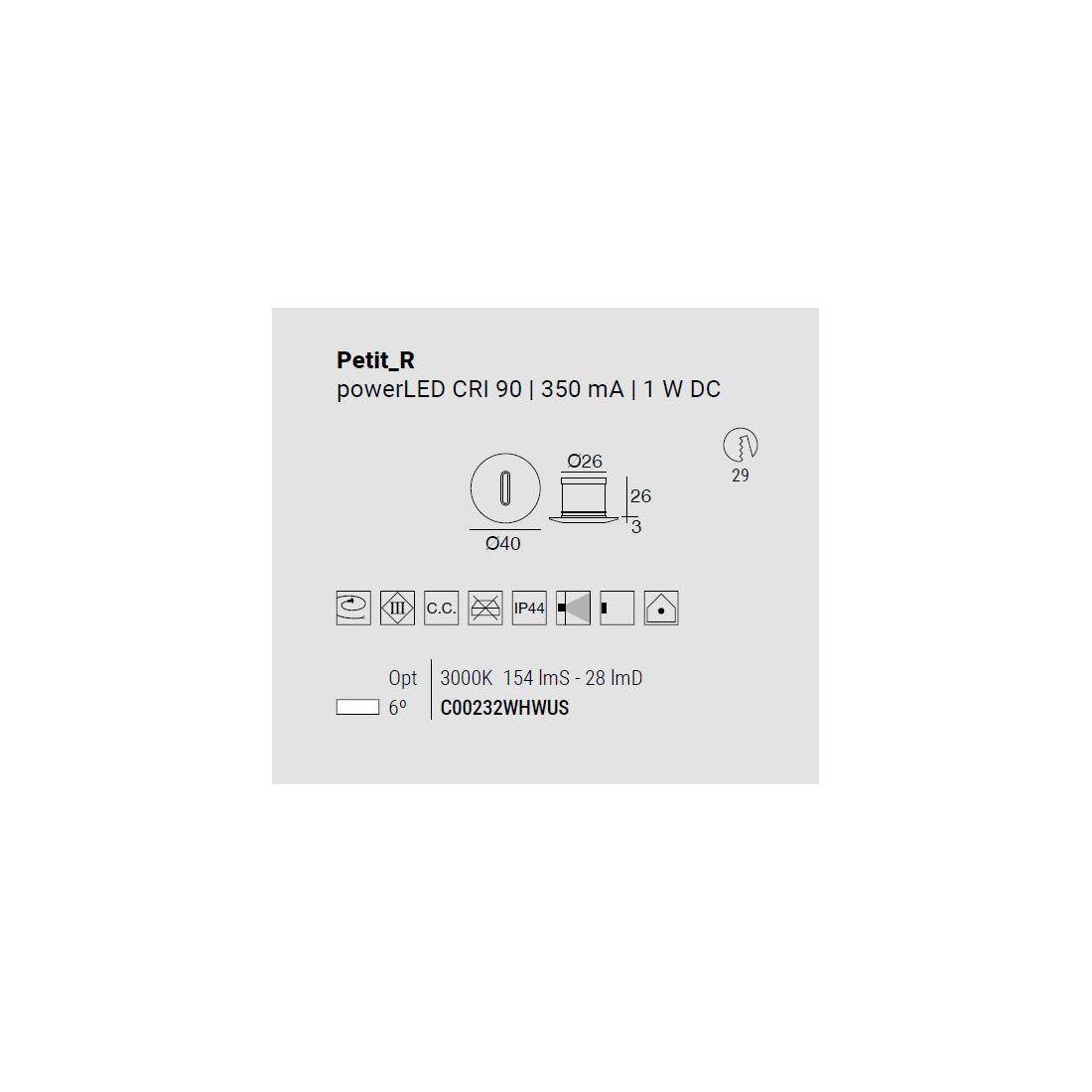 Per l'installazione in pareti in muratura sono necessarie le controcasse, da acquistare separatamente, che trovate con i codici 84915 o 84336 e per il funzionamento, inoltre, Petit necessita di un driver di alimentazione esterno, da acquistare separatamente; i driver compatibili sono disponibili direttamente sul nostro e-commerce con i codici: 89144 – 89145 – 99375.