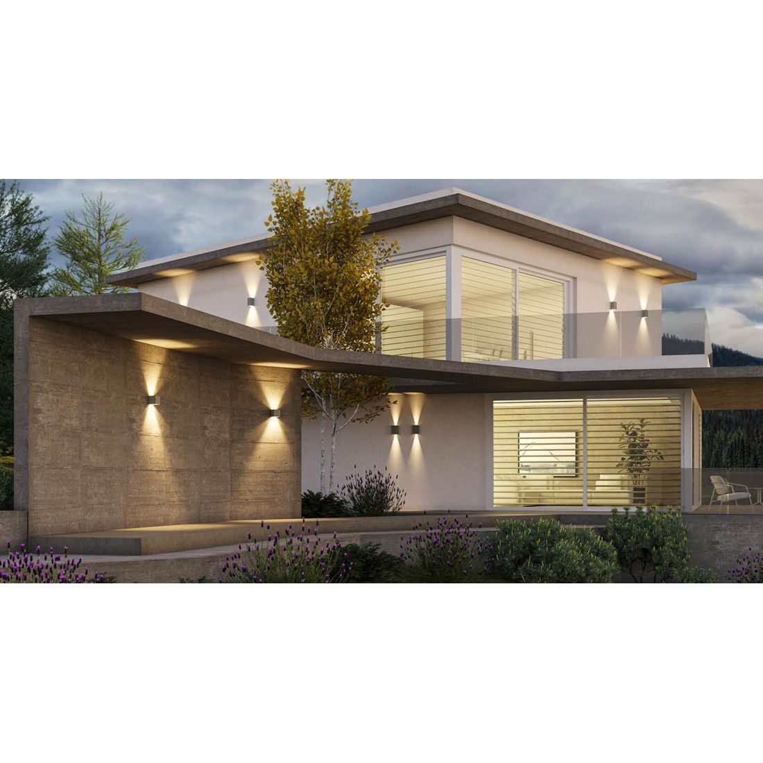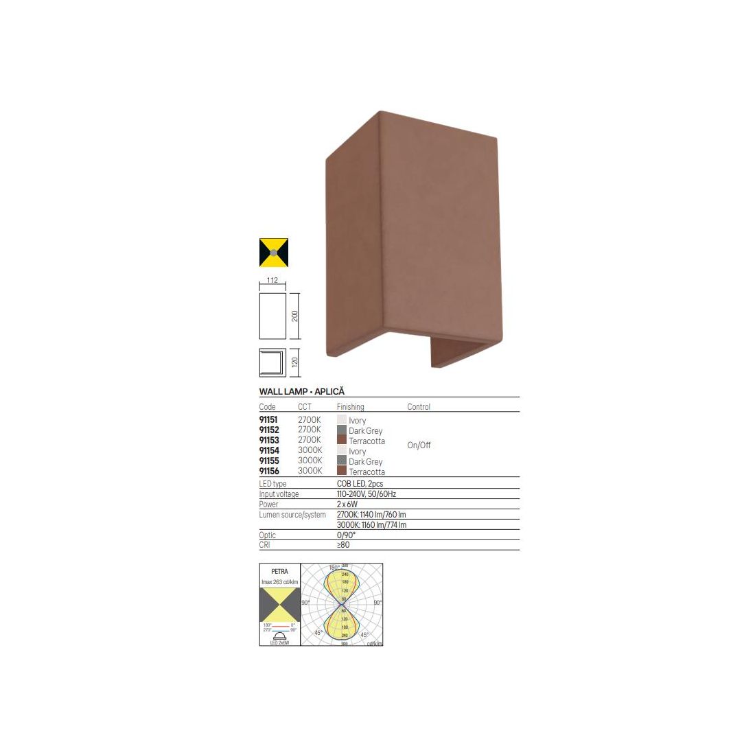 Applique di forma rettangolare, progettata per l'illuminazione di ambienti esterni come balconi, terrazzi, loggiati, porticati e facciate di edifici privati o commerciali, che viene realizzata in cemento disponibile nelle finiture Avorio, Antracite e Terracotta (a vostra scelta) con diffusore in vetro trasparente. Petra include alette interne orientabili (dette anche deflettori) che consentono di regolare con precisione il fascio luminoso emesso sia verso l'alto che verso il basso infatti è possibile personalizzare l'ampiezza e l'effetto dei coni di luce sulla parete creando giochi luminosi dinamici e suggestivi in qualsiasi momento.