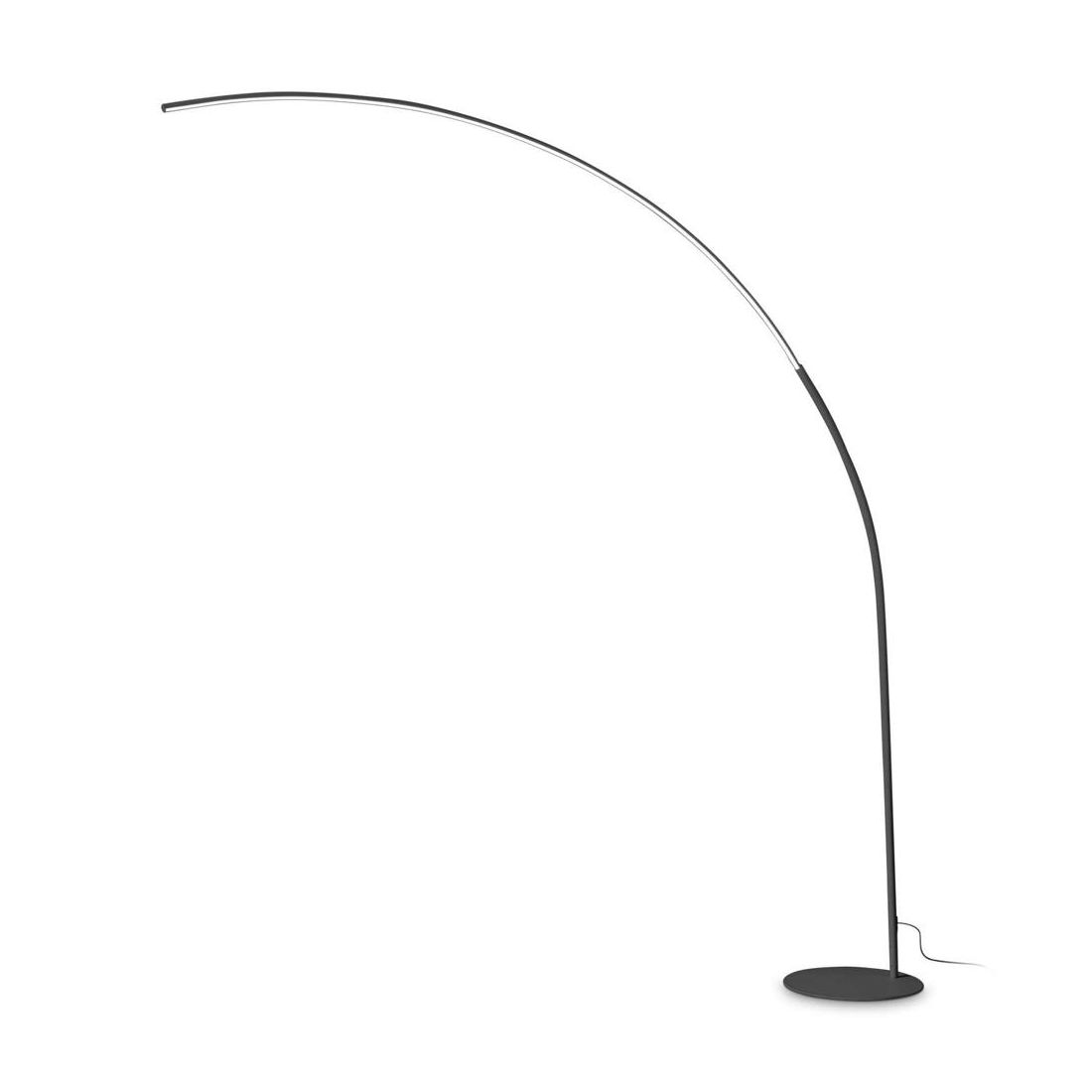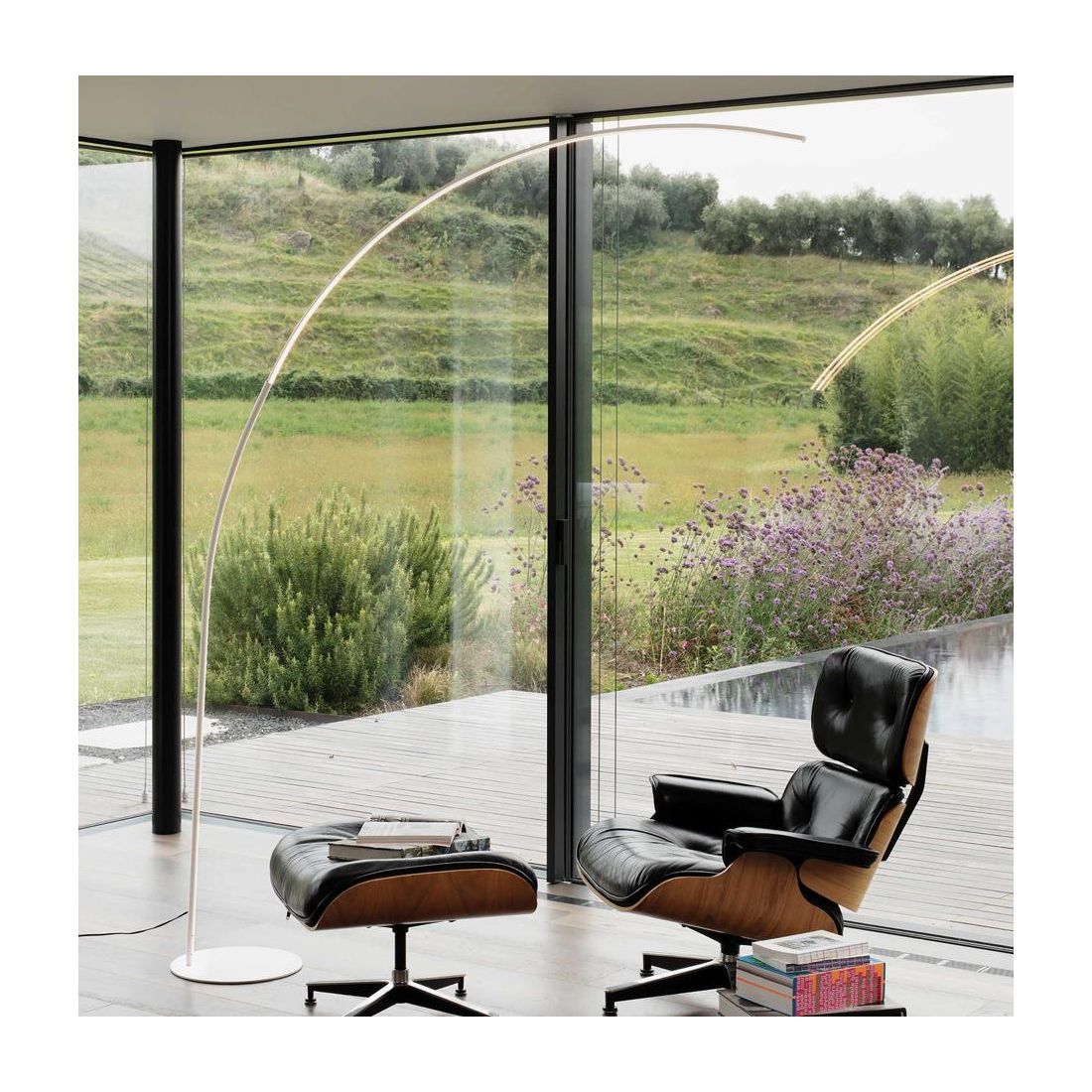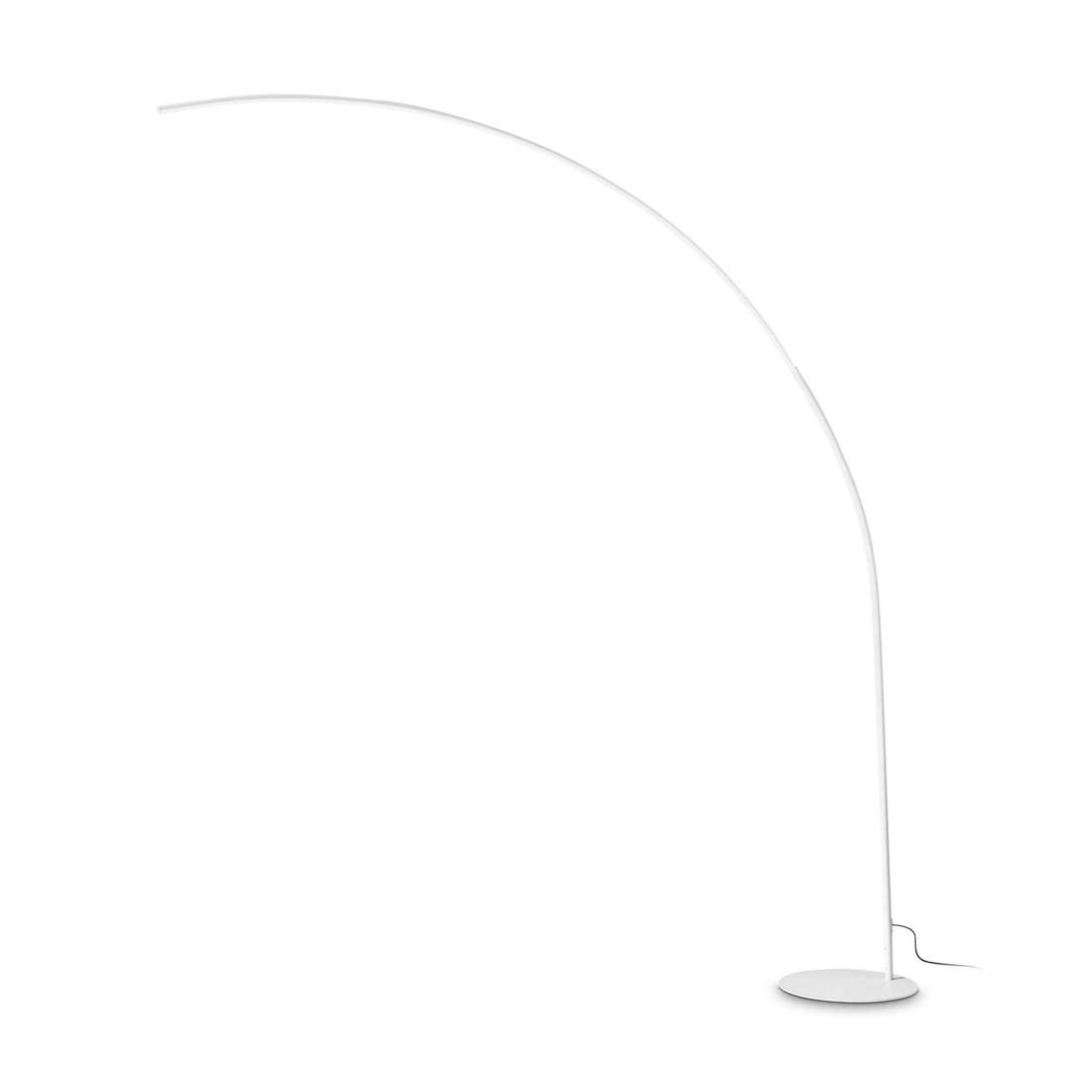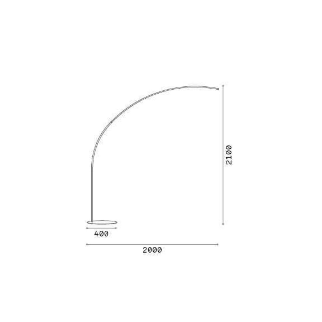 Lampada da terra o piantana ad arco, dal design moderno, con spessore sottile, composta da una barra sottilissima in metallo verniciato nei colori Bianco o Nero (a vostra scelta) che poggia sulla base rotonda sempre realizzata in metallo.