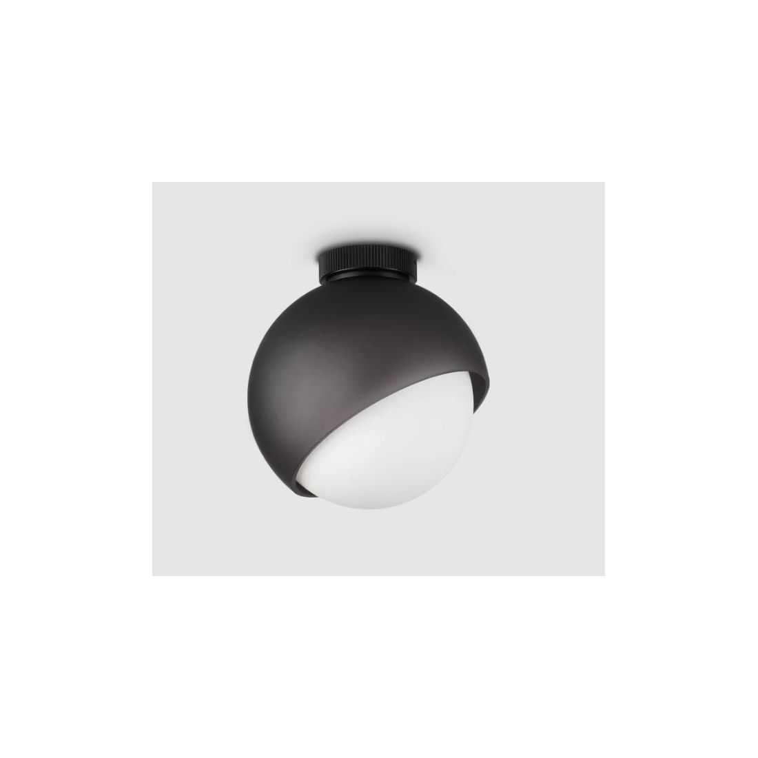 Piccola lampada da soffitto dal design moderno che si presenta con una montatura realizzata in metallo, con diffusore sferico in vetro soffiato bianco acidato, proposta in due diverse colorazioni: