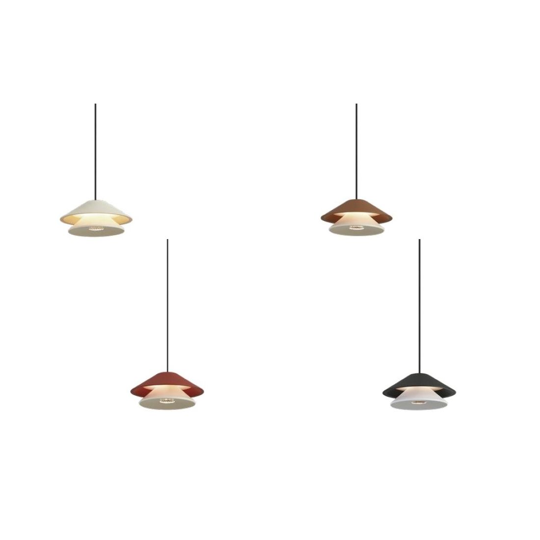 Lampada a sospensione singola dal carattere distintivo e dal design contemporaneo con la struttura composta da una montatura in metallo verniciato Nero e da due paralumi sovrapposti a forma di cappello che creano un piacevole gioco di volumi e contrasti. Il piatto inferiore è realizzato in metallo bianco mentre quello superiore è disponibile in quattro varianti cromatiche per adattarsi a differenti stili di arredo: Bianco, Marrone, Arancio e Nero.