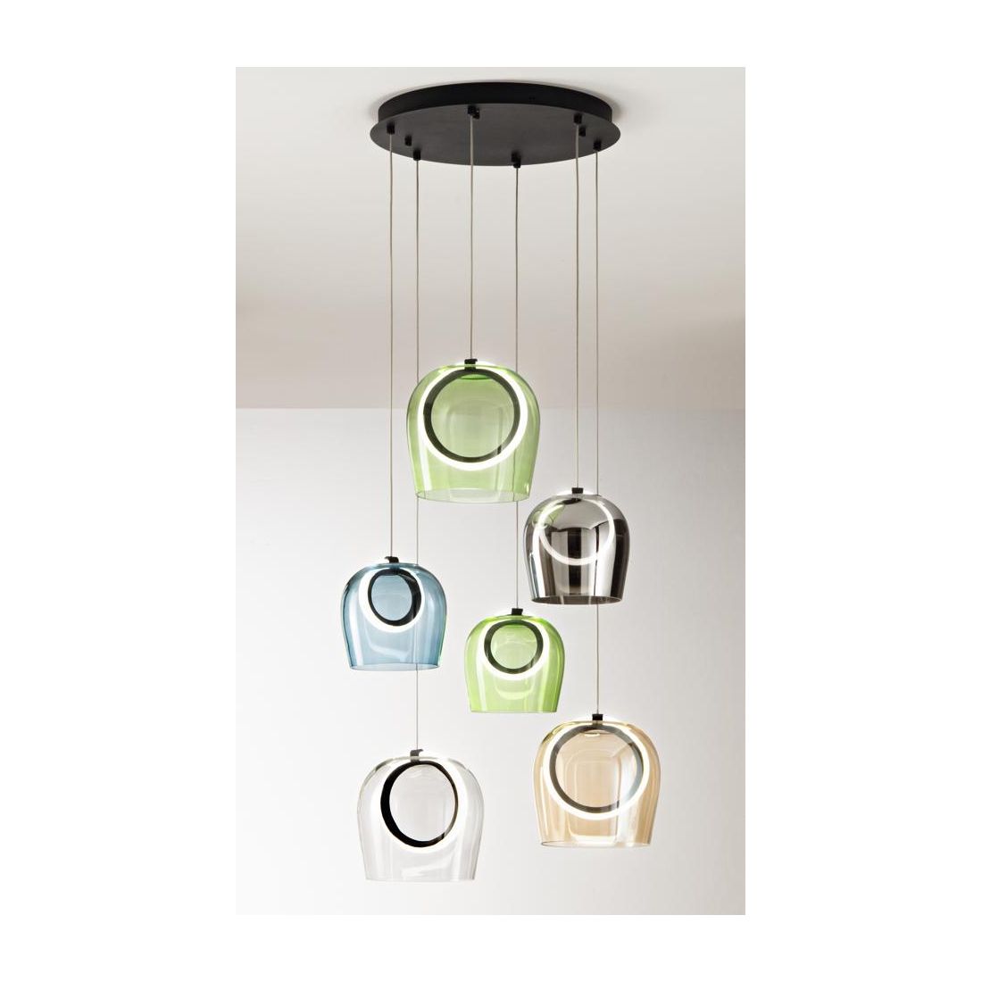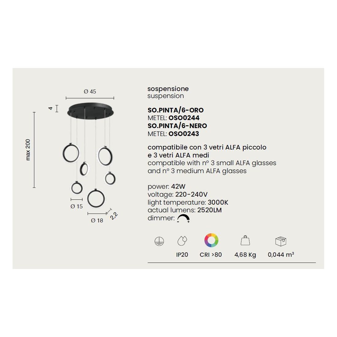 PINTA SOSPENSIONE 8 LUCI IN METALLO NERO O ORO CON DIFFUSORI A CERCHIO LED 68W LUCE...
