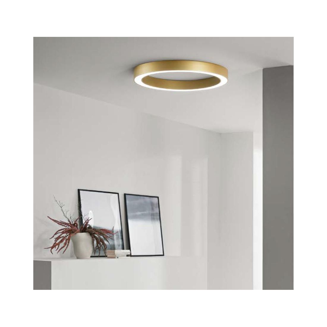 Plafoniera caratterizzata da un design moderno e da forme pulite che si presenta con una struttura circolare disponibile in tre diametri: 60 cm, 80 cm e 120 cm, che viene realizzata in metallo nelle finiture Oro, Nero e Bianco per armonizzarsi perfettamente con qualsiasi stile d’arredamento. Il diffusore in acrilico anti-abbagliamento garantisce una diffusione uniforme della luce creando un’illuminazione piacevole e senza fastidiosi riflessi.