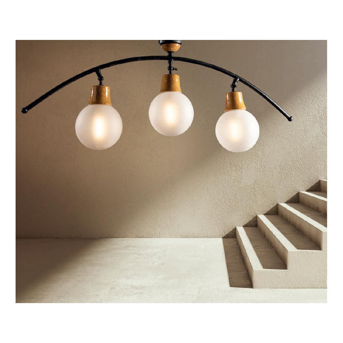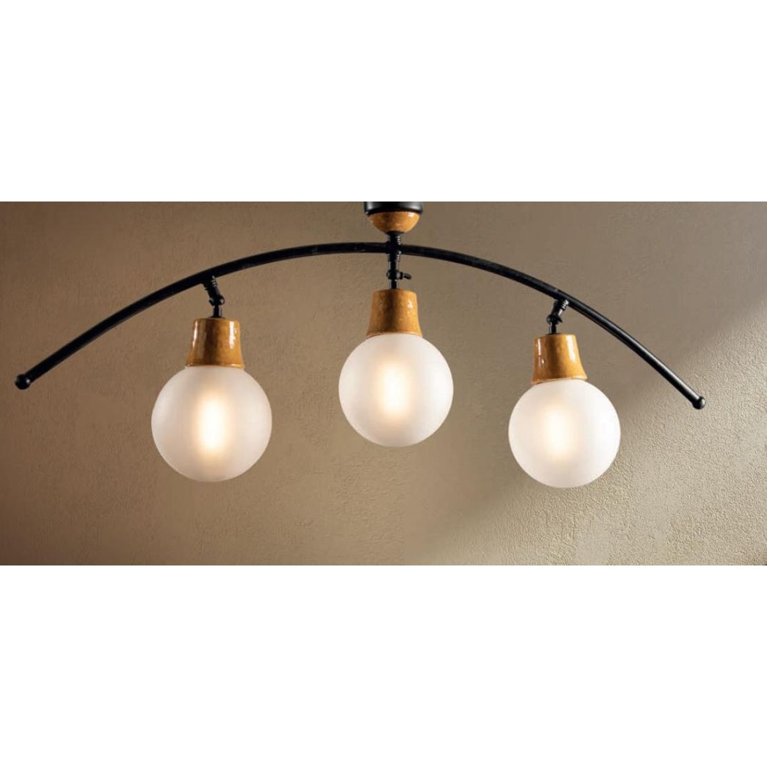 Plafoniera dal design esclusivo a curvatura, con una struttura realizzata in ottone verniciato di Nero che sostiene un arco armonioso che conferisce dinamismo e carattere a qualsiasi soffitto. Il cuore visivo dell'apparecchio è costituito da tre diffusori sferici in vetro Pyrex satinato bianco del diametro di 15 cm cadauno che assicurano una diffusione della luce morbida e omogenea, eliminando l'abbagliamento e creando un’atmosfera accogliente.