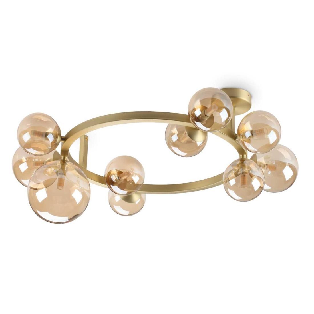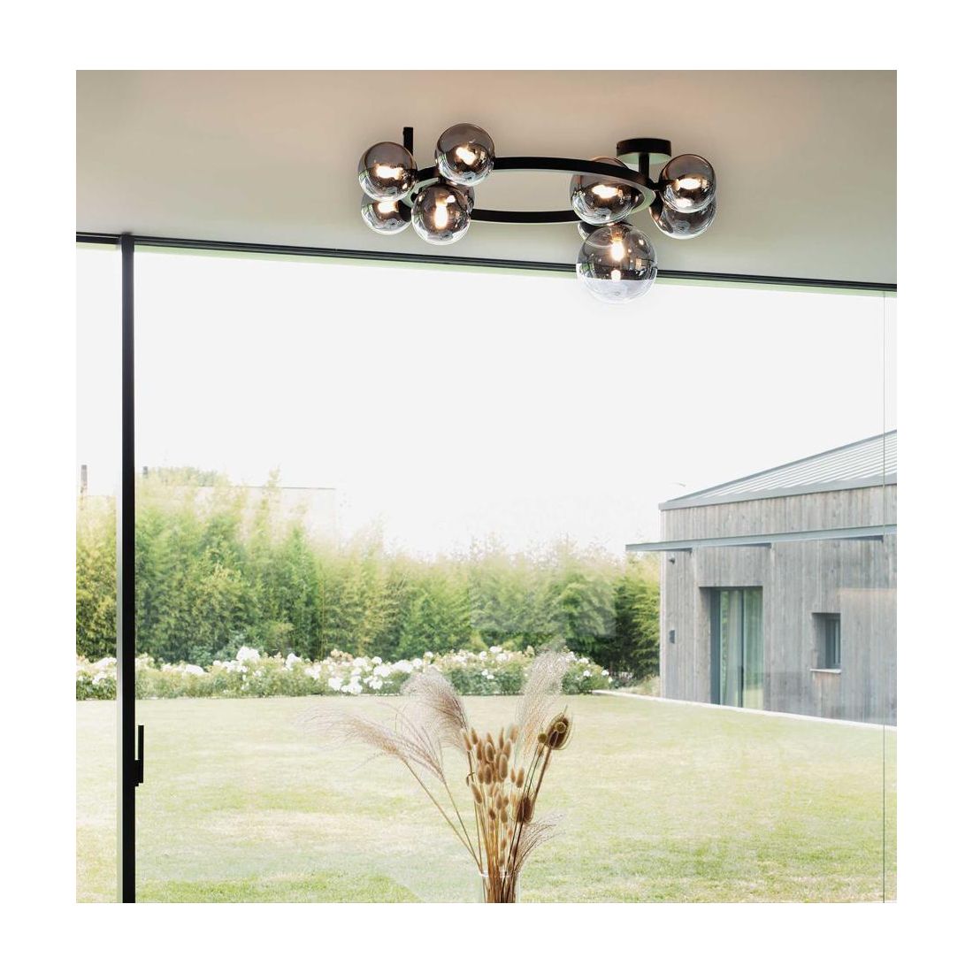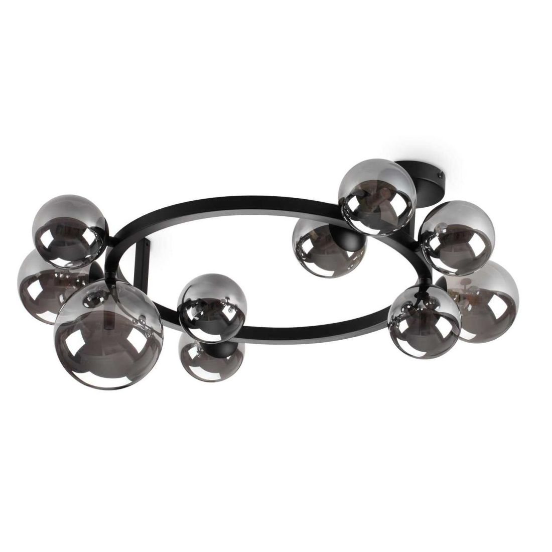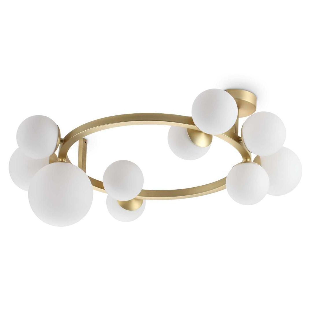 Plafoniera dal design moderno, con una struttura di forma circolare del diametro di cm 70, con uno stile vistoso e raffinato, che si presenta con una montatura in metallo con finitura Nera oppure Ottone satinato con ancorati 10 diffusori a sfera realizzati in vetro soffiato.