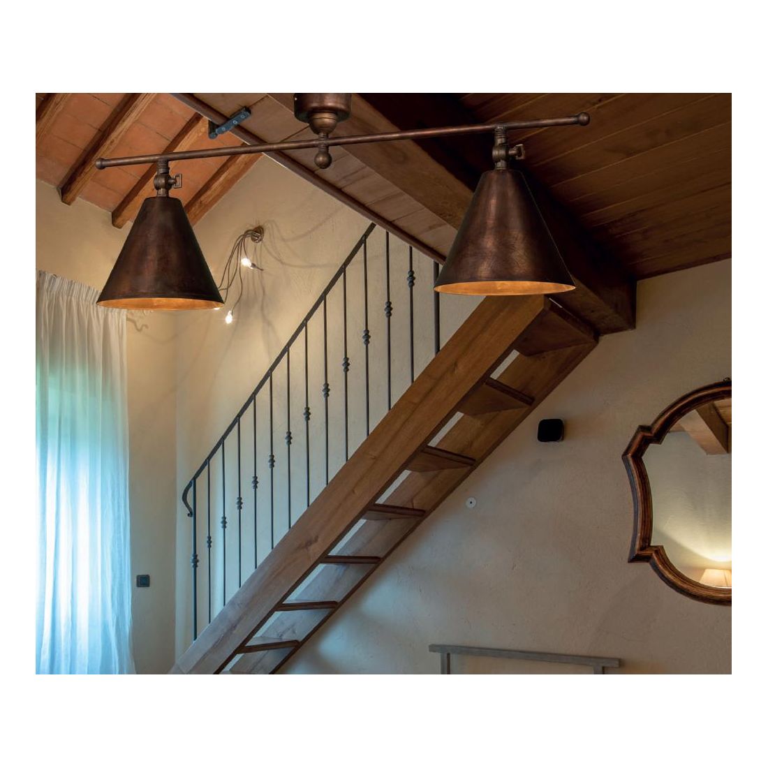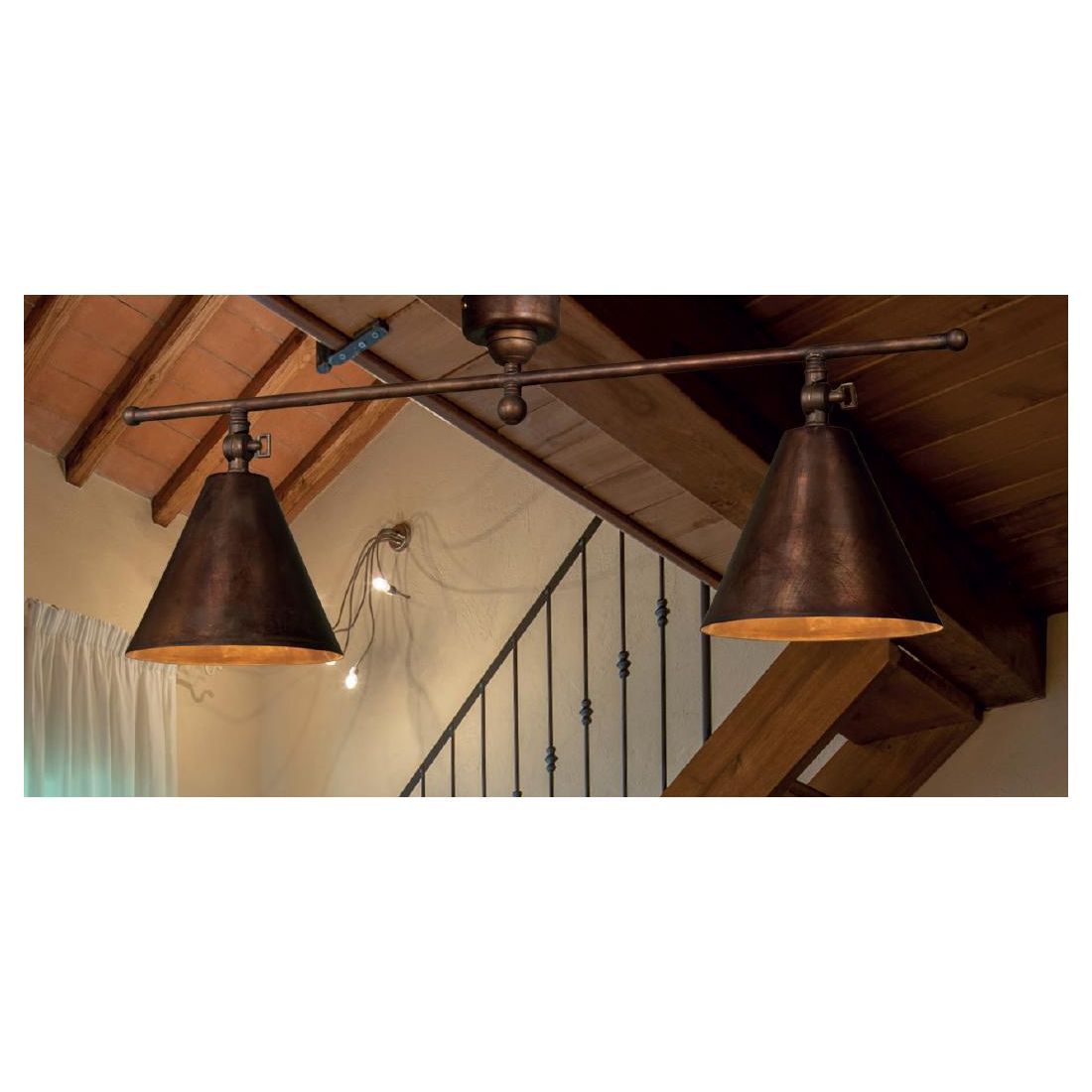 Plafoniera lineare a 2 luci, dallo stile rustico, che si presenta con una struttura interamente realizzata in Ottone anticato composta da asta lunga cm 75 e da 2 diffusori a campana, del diametro di cm 18 cadauno, dotati di snodo utili per poter direzionare ciascun punto luce dove più vi necessitano.