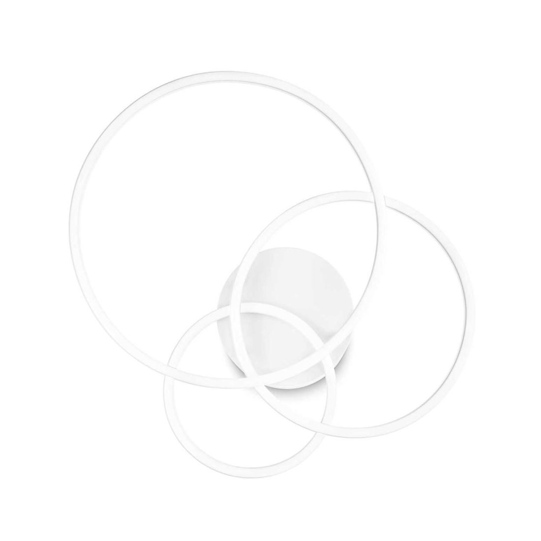 Plafoniera con un design moderno composta da base rotonda a soffitto e da tre cerchi, sovrapposti l'uno all'altro, di diverse dimensioni, il tutto realizzato in metallo verniciato con diffusori in materiale plastico color opale, che emettono una luce diffusa nell'ambiente.