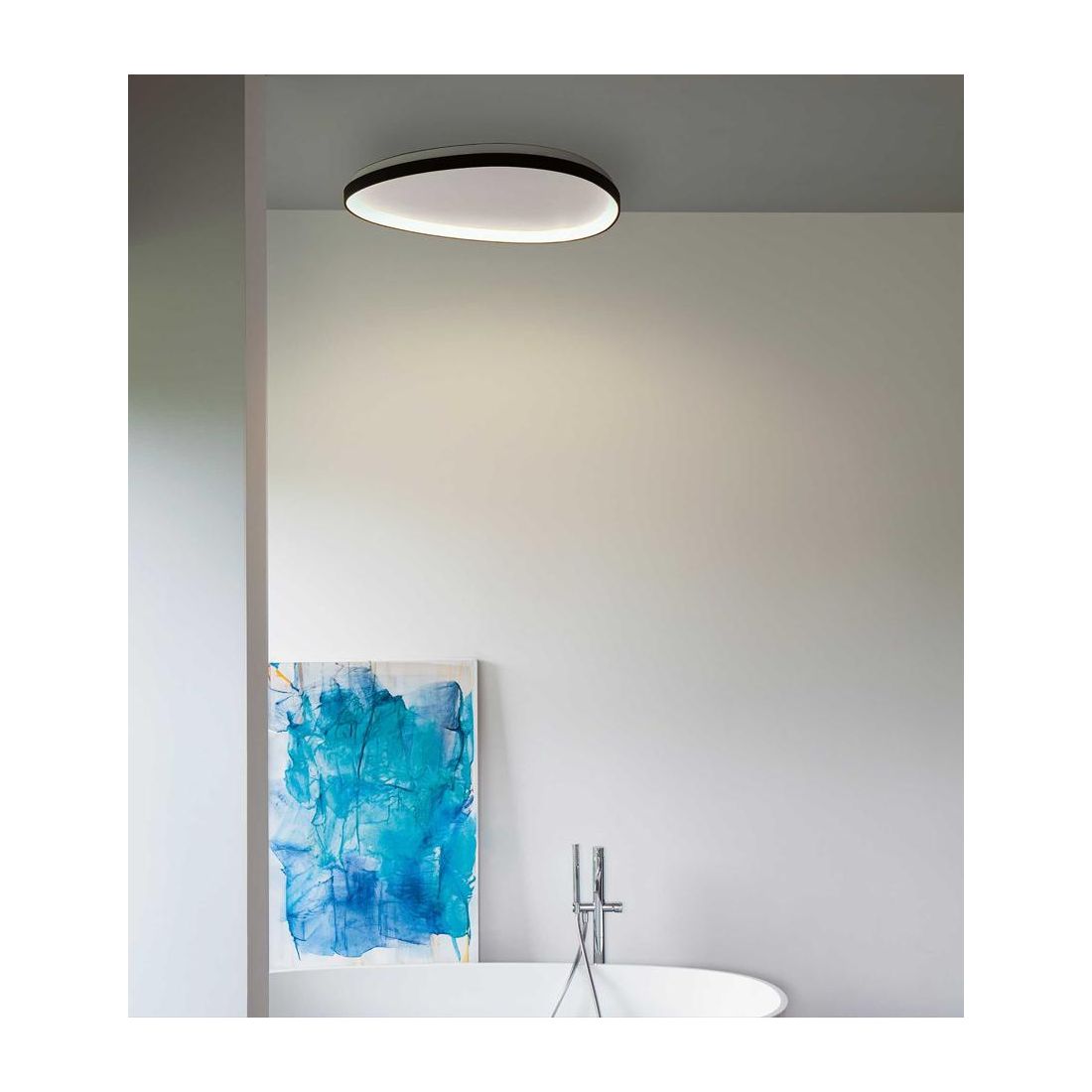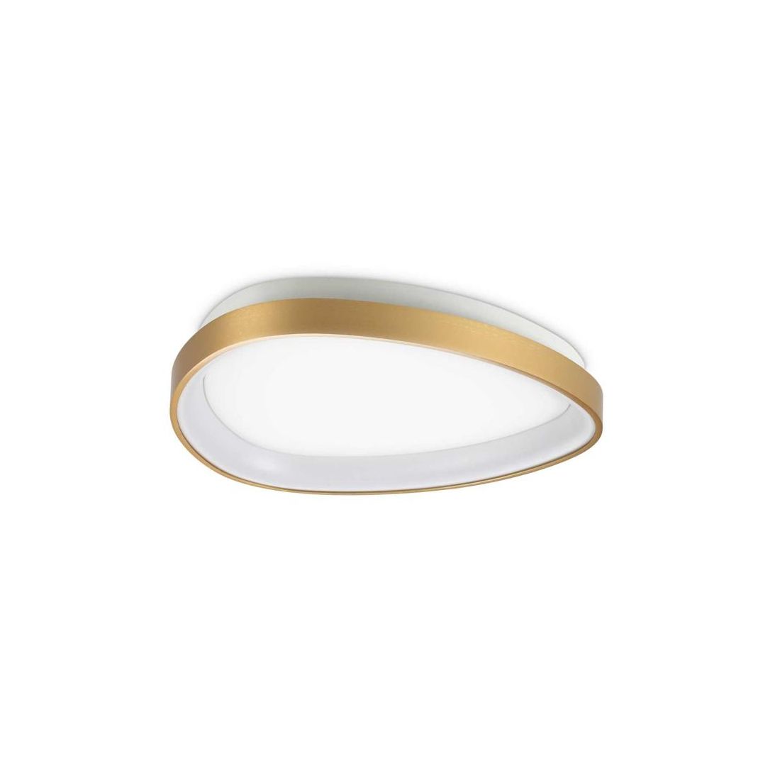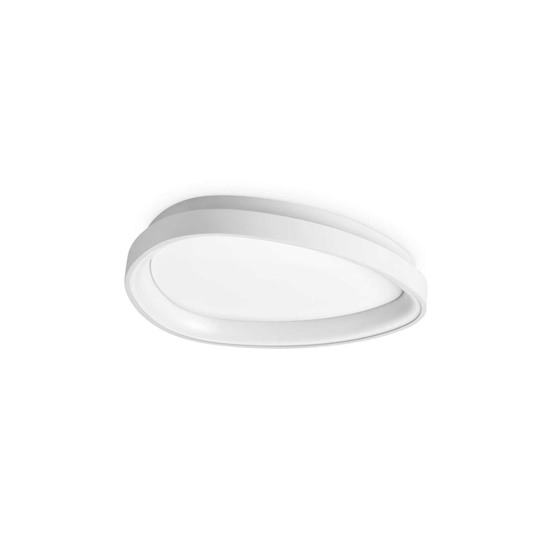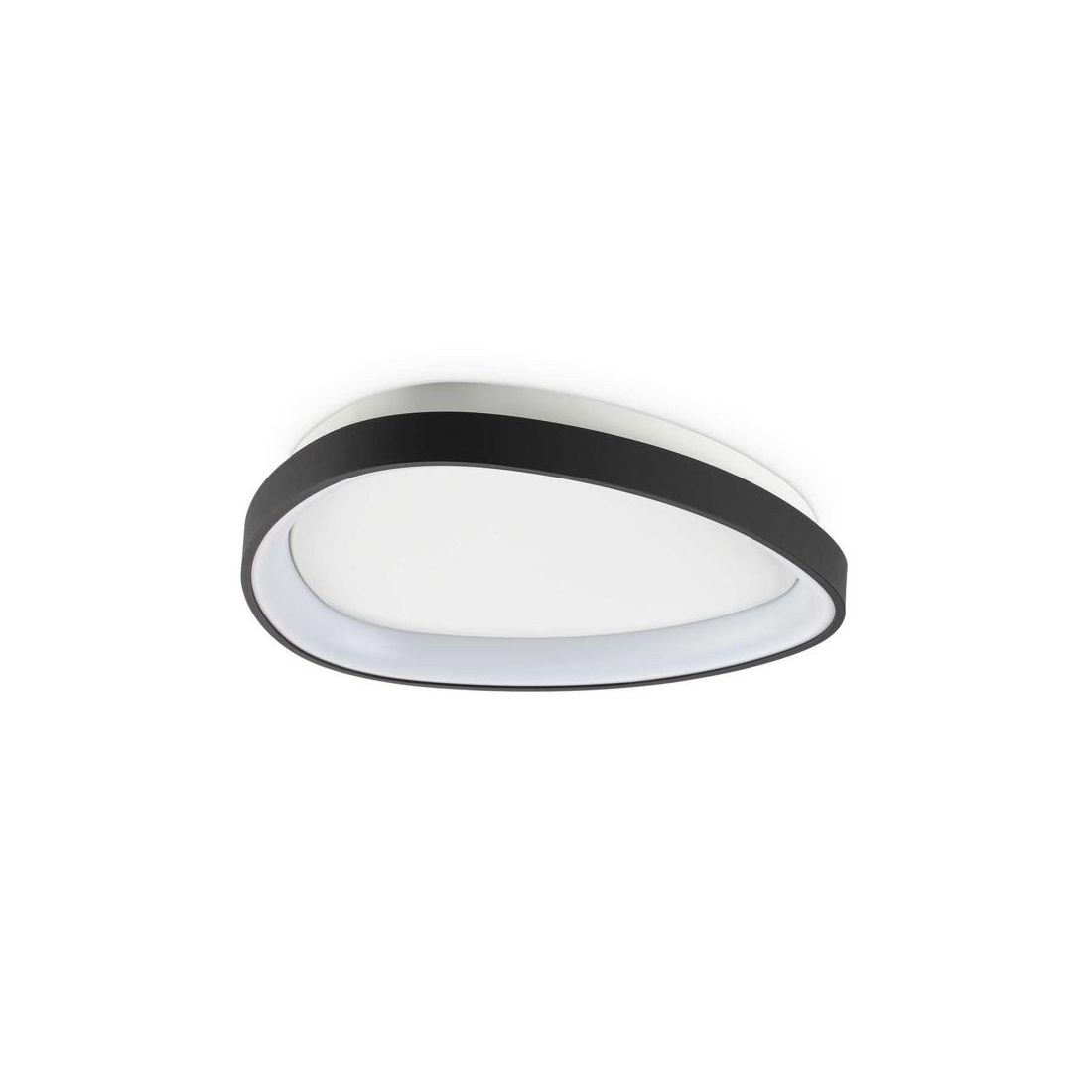 Plafoniera dal design moderno, di forma ovale, con una struttura particolare realizzata in metallo verniciato parzialmente rivestita da un diffusore in policarbonato opale, con una spettacolare resa luminosa.
