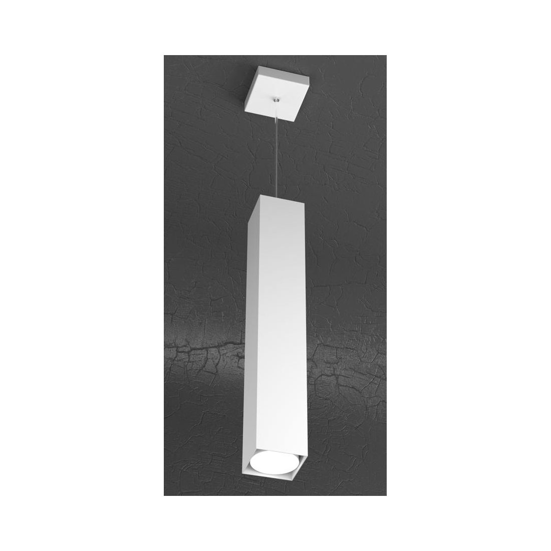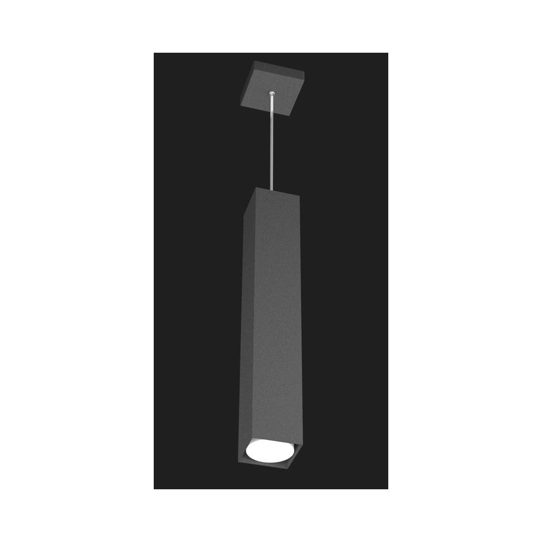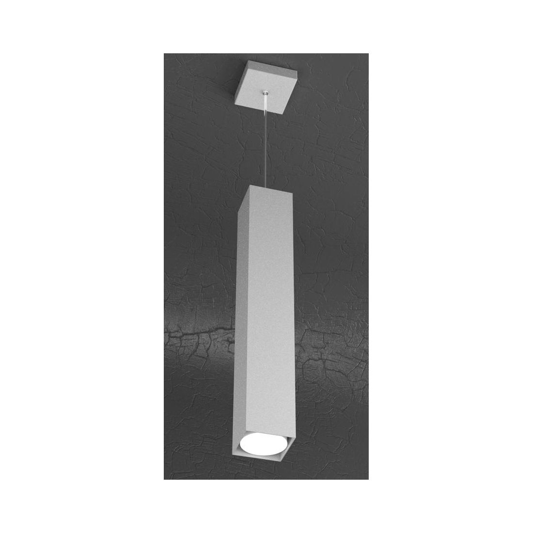 Sospensione singola, con un diffusore alto cm 50 con una forma squadrata, realizzata interamente in metallo verniciato nei colori Bianco, Grigio, Sabbia e Antracite (a vostra scelta) con il corpo che lascia la lampadina a vista senza penalizzazioni estetiche.