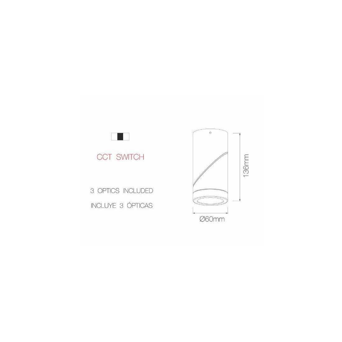 Tre temperature di colore che possono essere modificate con un solo clic per scegliere la temperatura indicata per ogni occasione (2700 K, 3000 K, 4000 K) grazie alla tecnologia CCT Switch. Tre diverse ottiche (15º, 35º e 60º) che possono essere cambiate svitando la parte frontale del prodotto, anche se è già stato installato.