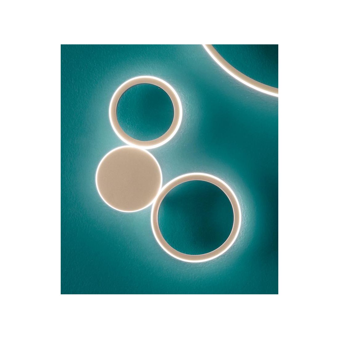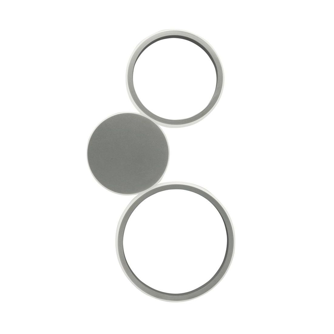 Lampada da parete moderna dal design molto originale costruita in alluminio e disponibile nei colori oro satinato o grigio satinato. Una composizione di anelli o cerchi di varie dimensioni uniti tra loro e ricoperti nella parte esterna da un diffusore bianco latte che racchiude una strip led.