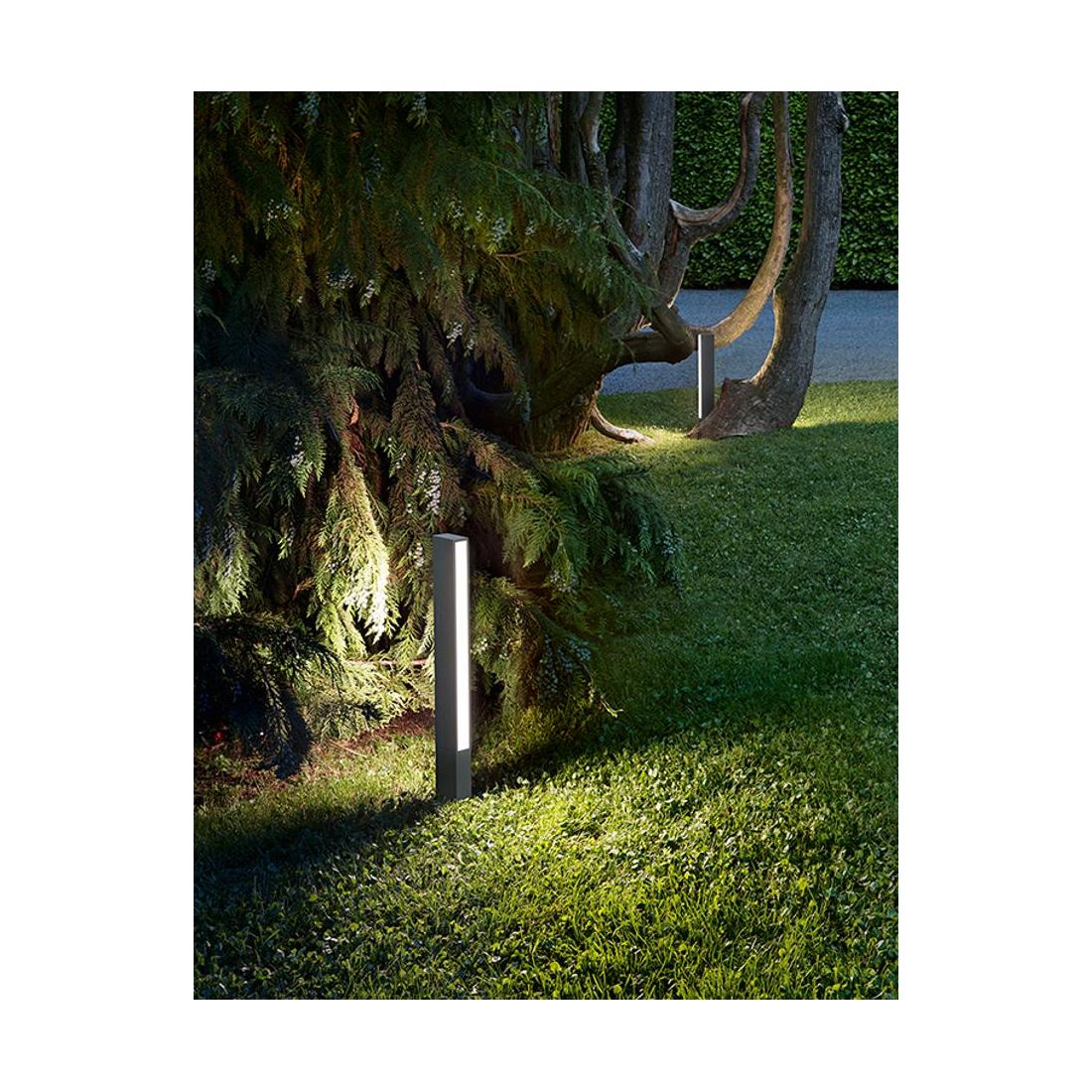 L’illuminazione su entrambi i lati del paletto offre un effetto scenico raffinato e una maggiore diffusione luminosa, ideale per valorizzare il paesaggio e l’architettura degli spazi outdoor.