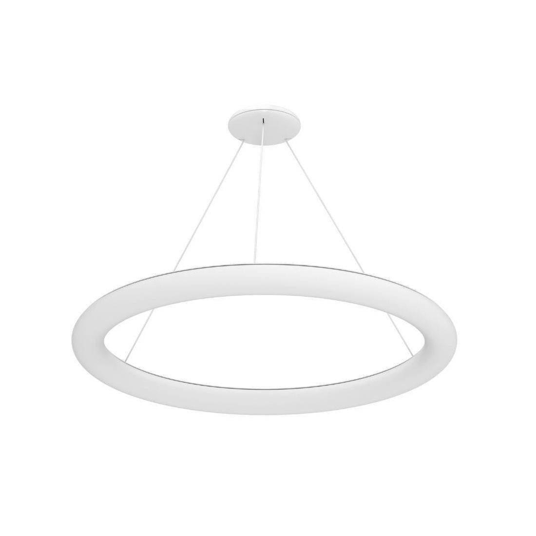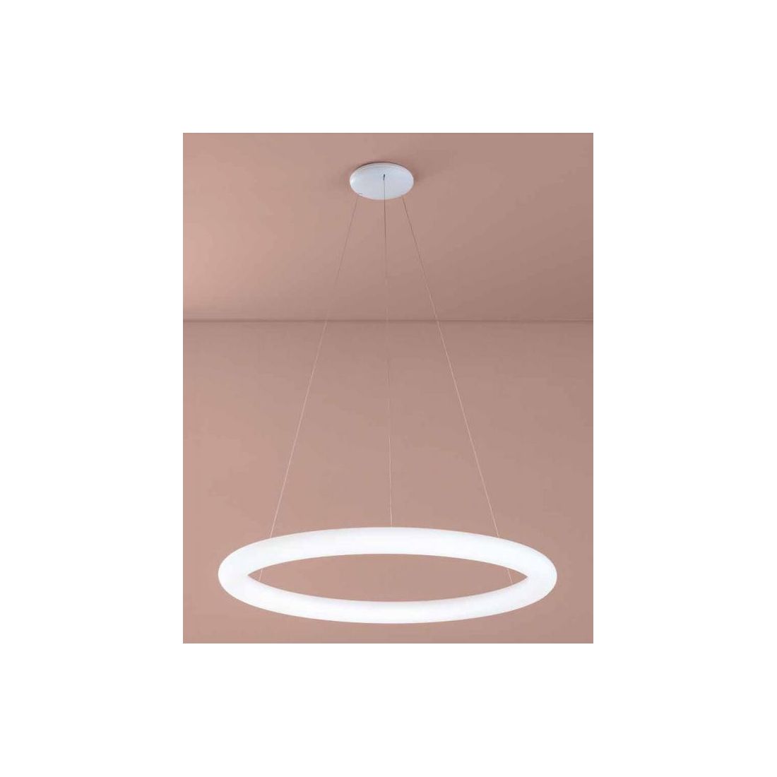 Lampadario a sospensione dal design moderno con una forma circolare, ad anello forato che richiama la forma del classico neon, realizzato in metallo verniciato di bianco con il diffusore in polietilene bianco che emette una luce diffusa verso il basso.