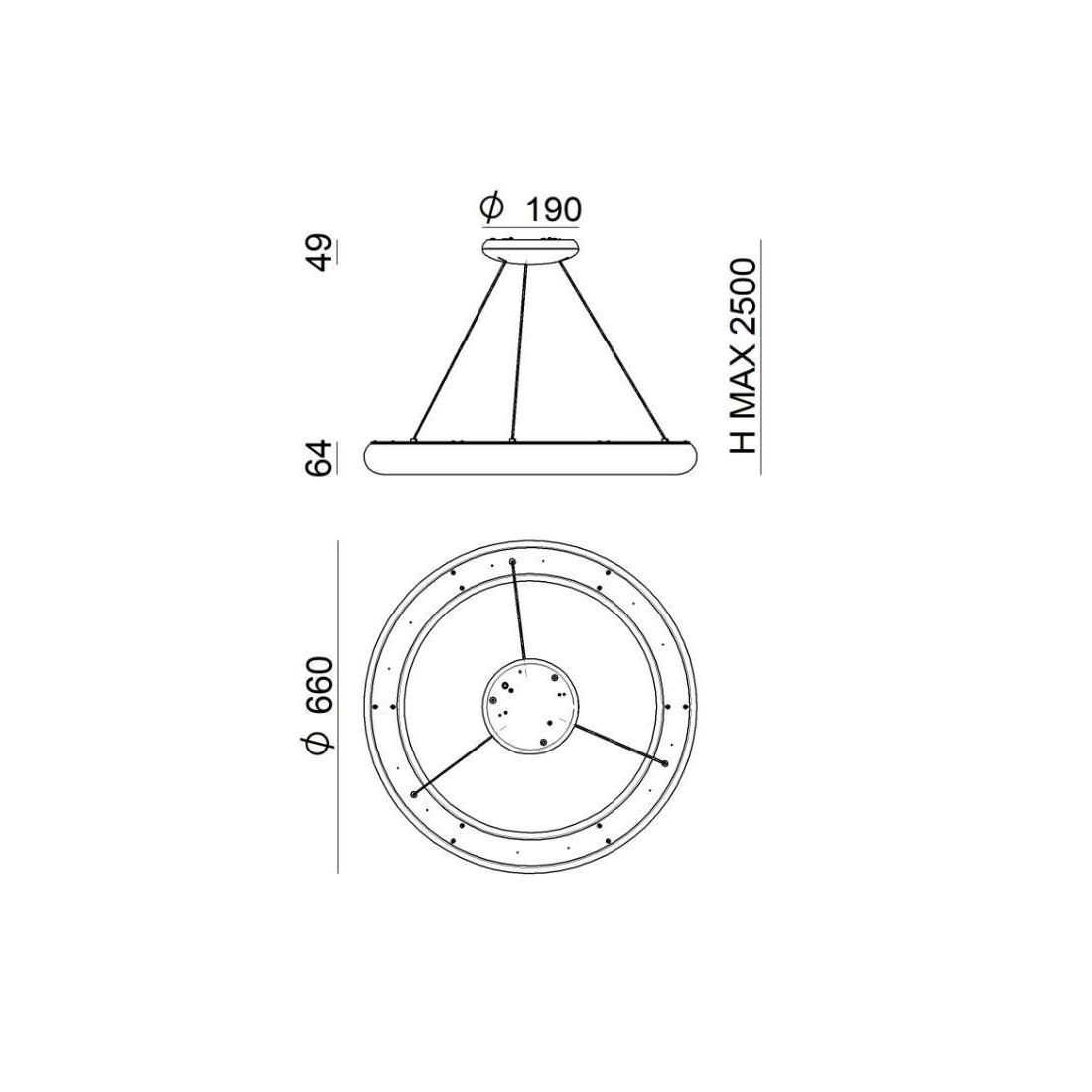 Il design minimale di questo lampadario è adatto ad illuminare spazi domestici moderni come ad esempio la cucina, il soggiorno, salotto, camera da letto oppure l'ufficio; la sorgente luminosa LED da 31w, di colore bianco caldo, con distribuzione luminosa General Lighting, è composta da 1 LED topled, con una CCT 3000 K ed un CRI 80; il flusso luminoso della sorgente è di 3650 lm, con un'efficienza nominale di 130.4 lm/W.