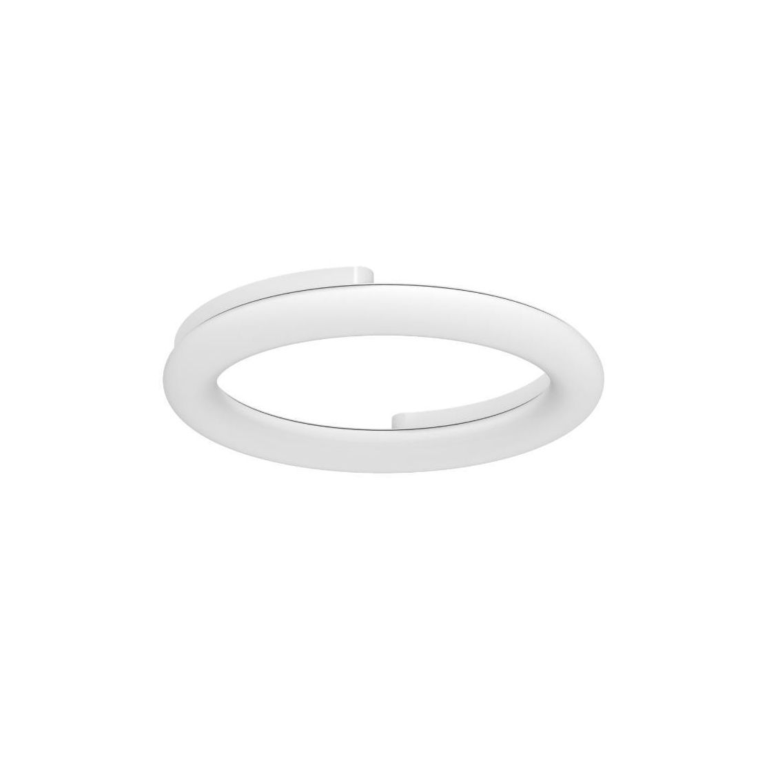 Plafoniera dal design moderno con una forma circolare, ad anello forato che richiama la forma del classico neon, con montatura realizzata in metallo verniciato di bianco e con il diffusore in polietilene bianco che emette una luce diffusa verso il basso.