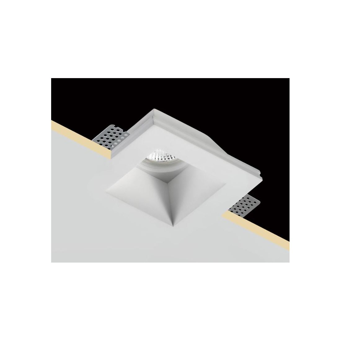 Priamo si incassa in controsoffitto in gesso; è l’ideale per le installazioni trimless ottenibili con rasatura finale del controsoffitto; è costituito da una cornice in gesso bianco lisciato completa di staffa distanziatrice e portalampada per sorgenti con attacco GU10.