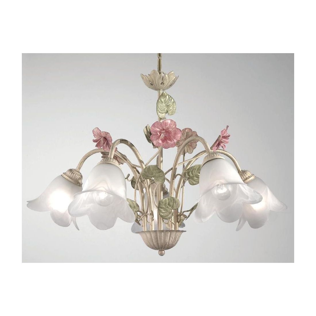 PRIMAVERA PLAFONIERA 5 LUCI CLASSICA AVORIO DECORATA CON FIORI ROSA E FOGLIE VERDI
