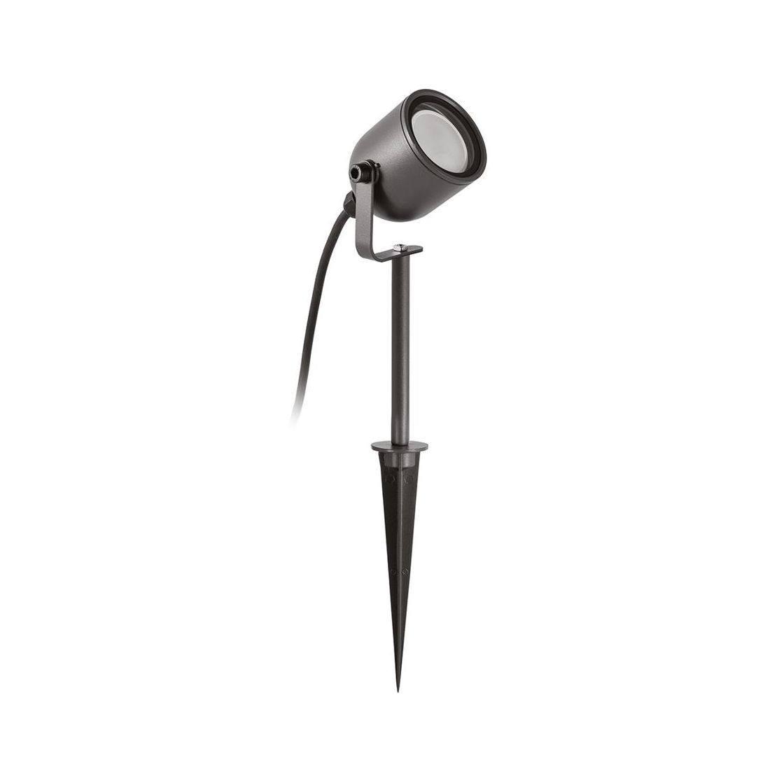 Proiettore da giardino, dal design moderno, con struttura realizzata in alluminio con finitura Bianca, Marrone o Antracite (a vostra scelta), con diffusore in vetro trasparente, orientabile, che permette di puntare il fascio luminoso con precisione valorizzando architetture o elementi naturali.