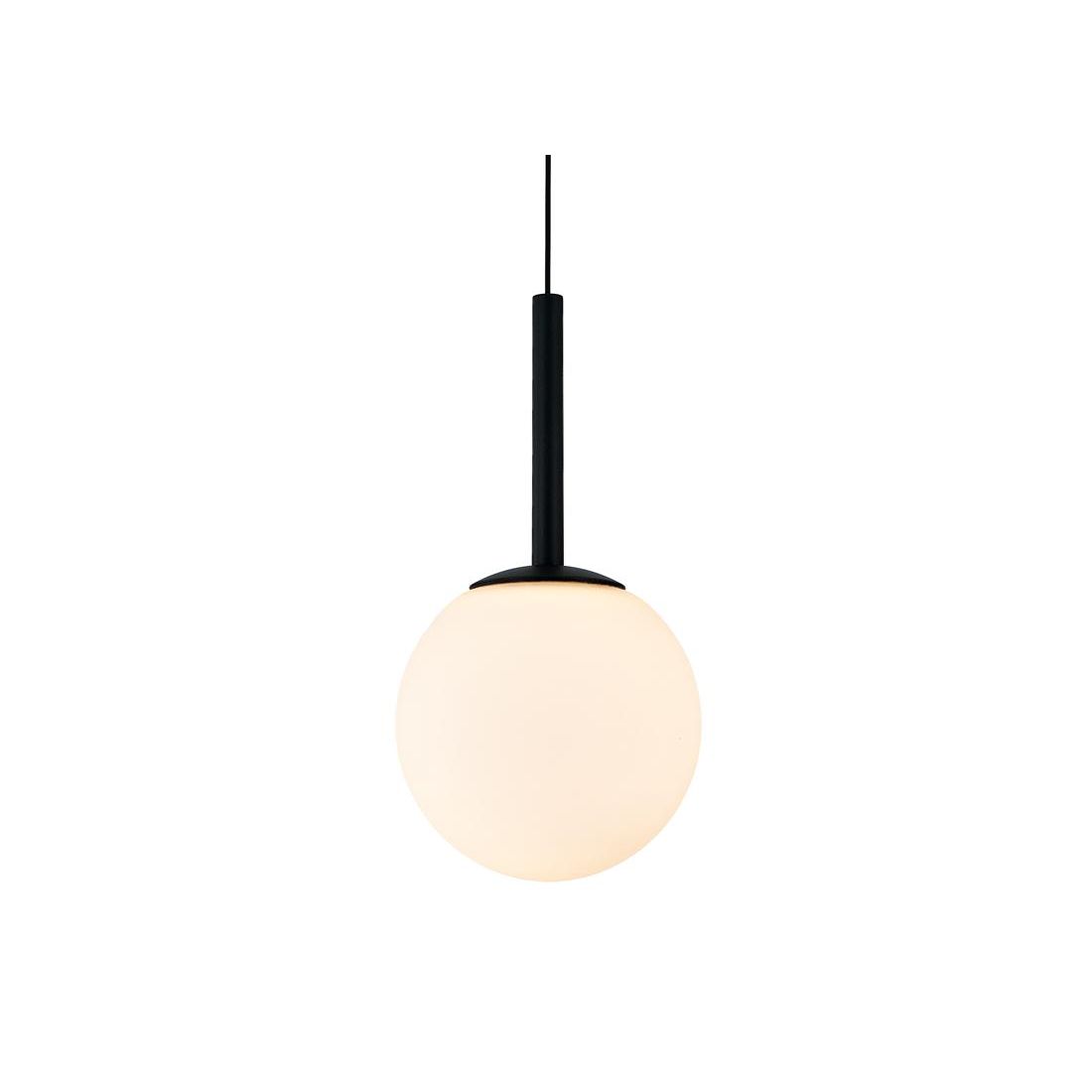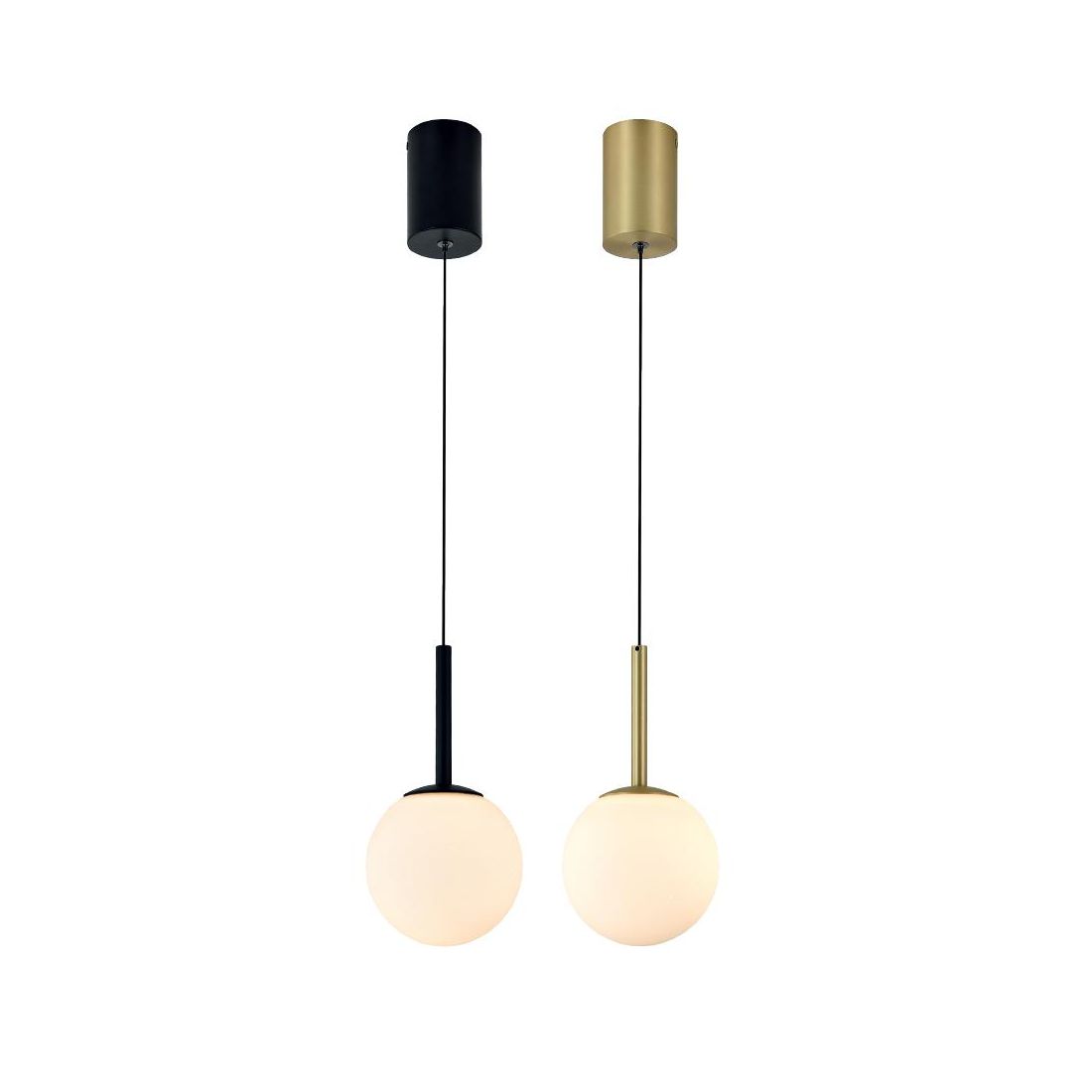 Sospensione singola, dal design moderno ed raffinato, che si presenta con montatura a soffitto realizzata in alluminio verniciato disponibile in due finiture: Nero opaco, per ambienti sofisticati e moderni oppure Oro satinato, ideale per aggiungere calore e stile con un tocco glamour. Il diffusore a forma di sfera bianca con diametro di 12,5 cm, in finitura opaca, assicura una luce soffusa e omogenea che valorizza l’ambiente senza abbagliare.