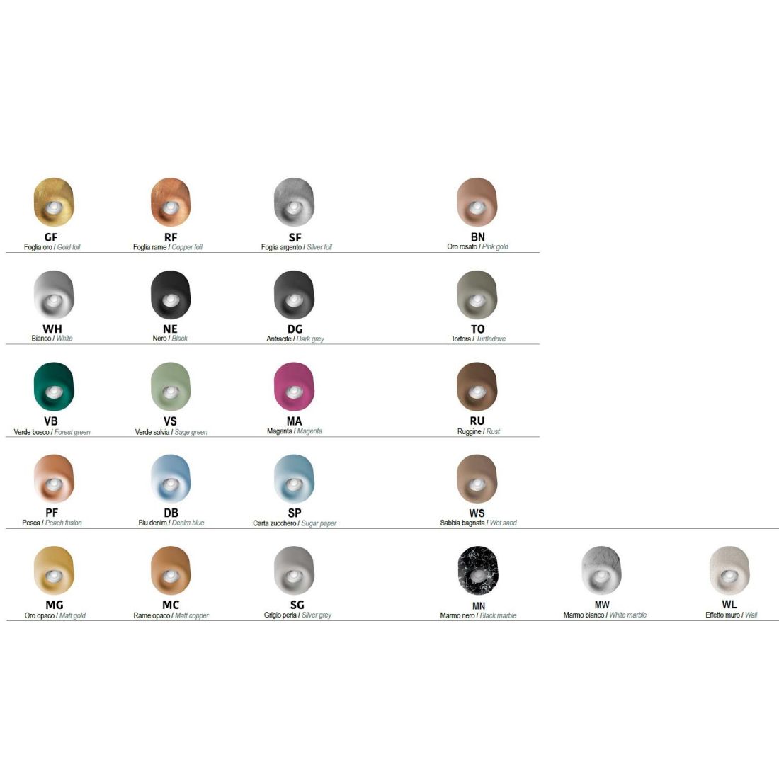 Quest'ultima finitura, chiamata Wall Finish, offre una libertà progettuale senza precedenti: la superficie è appositamente trattata per essere tinteggiata, permettendo alla lampada di mimetizzarsi con la parete o di diventare una tela bianca per decorazioni a mano, trasformando un punto luce in un dettaglio artistico unico.