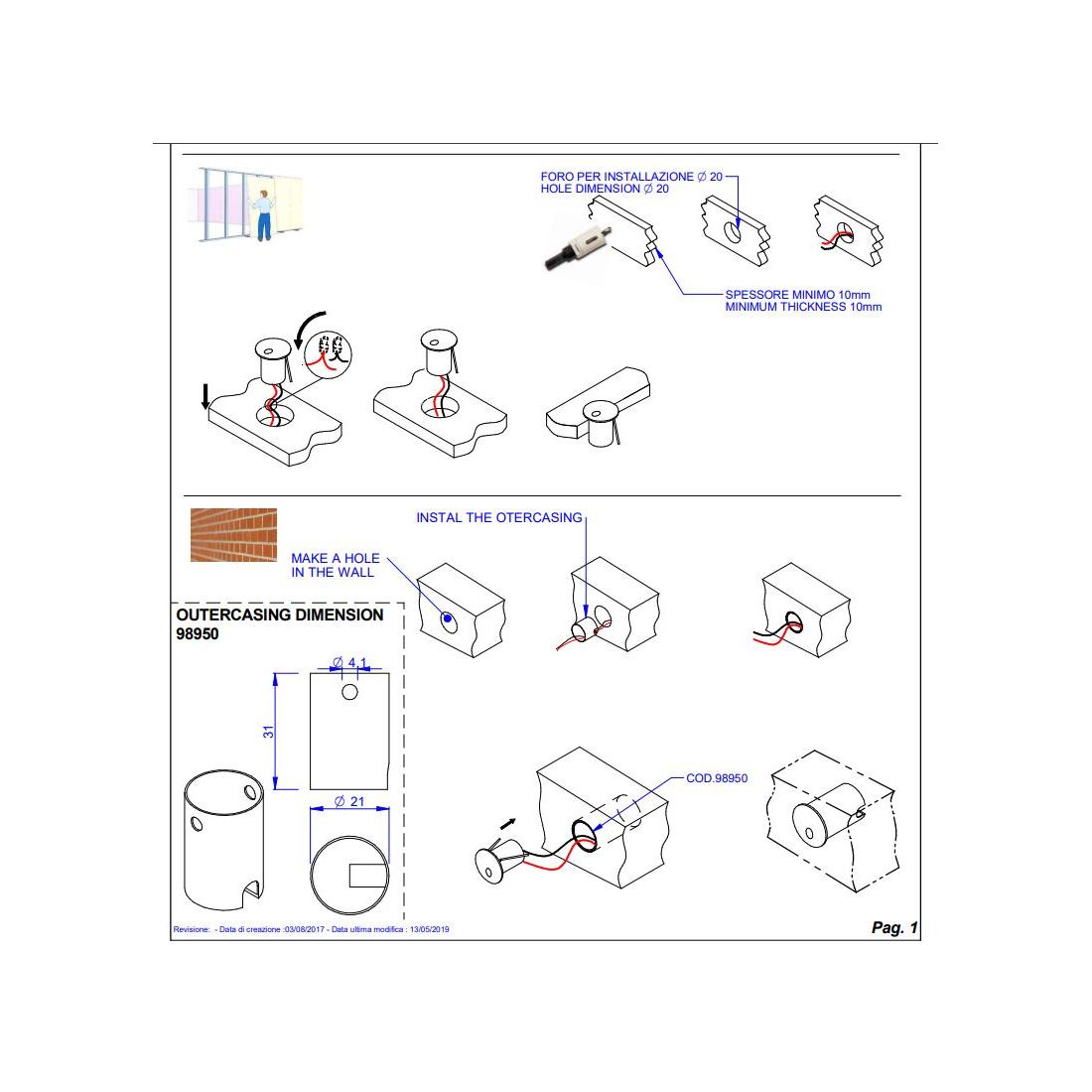 Per un'installazione a regola d'arte in pareti in muratura è necessario l'uso di una controcassa (codice 98950), disponibile separatamente sul nostro sito web. Inoltre, il dispositivo necessita di un alimentatore esterno per il corretto funzionamento, che può essere selezionato tra i modelli compatibili (codici 89144, 89145, 99375), tutti acquistabili sul nostro e-commerce.