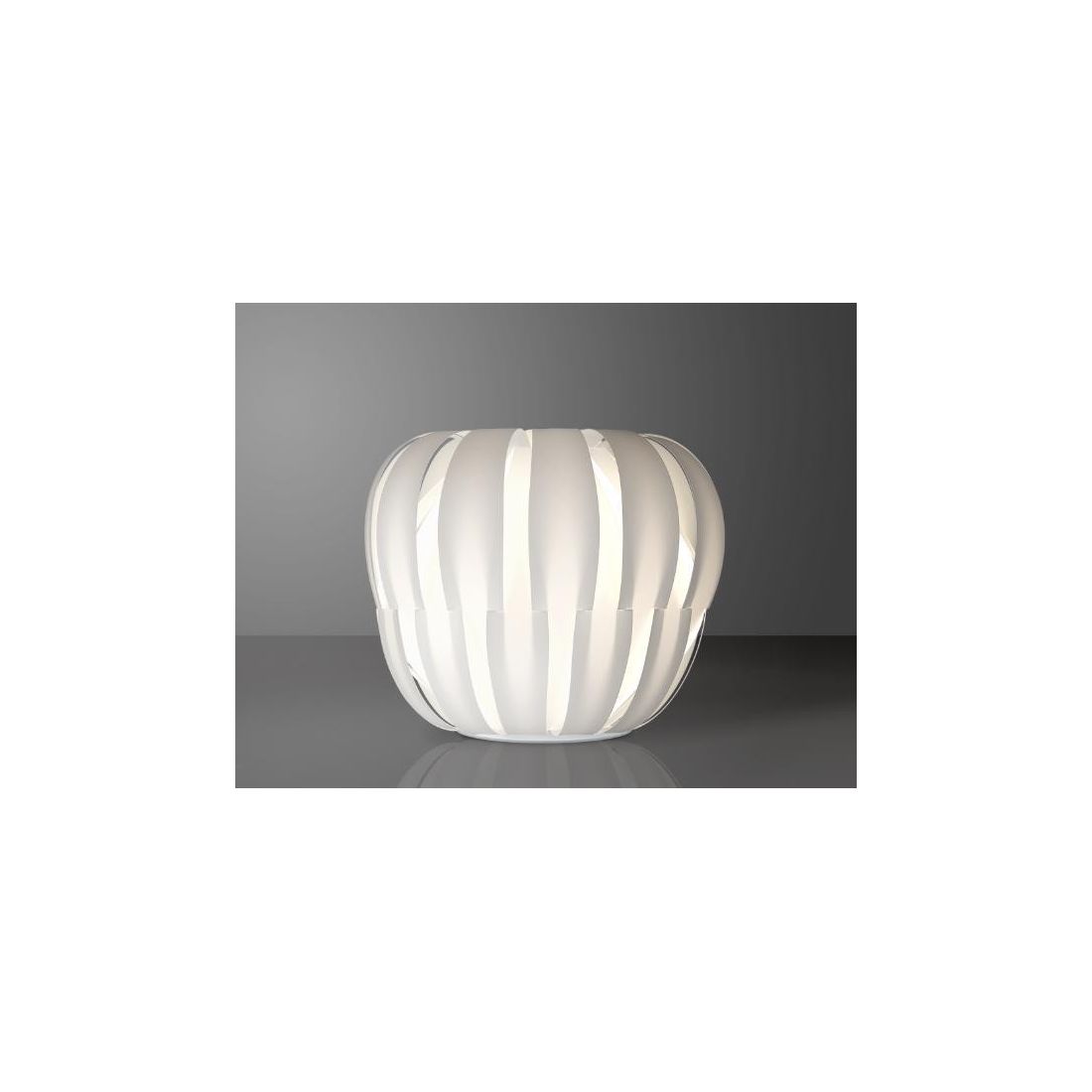 Lampada da tavolo con diametro di cm 29, con design moderno e originale, con diffusore che richiama la forma di una simpatica zucca di Halloween interamente realizzato in Polilux composto da 24 strisce, sovrapposte parzialmente l'una sopra all'altra, che donano un effetto luce fortemente espressivo e glamour; particolarmente indicata per l'illuminazione di soggiorni, salotti, camere da letto oppure uffici con arredo del tutto moderno o contemporaneo.