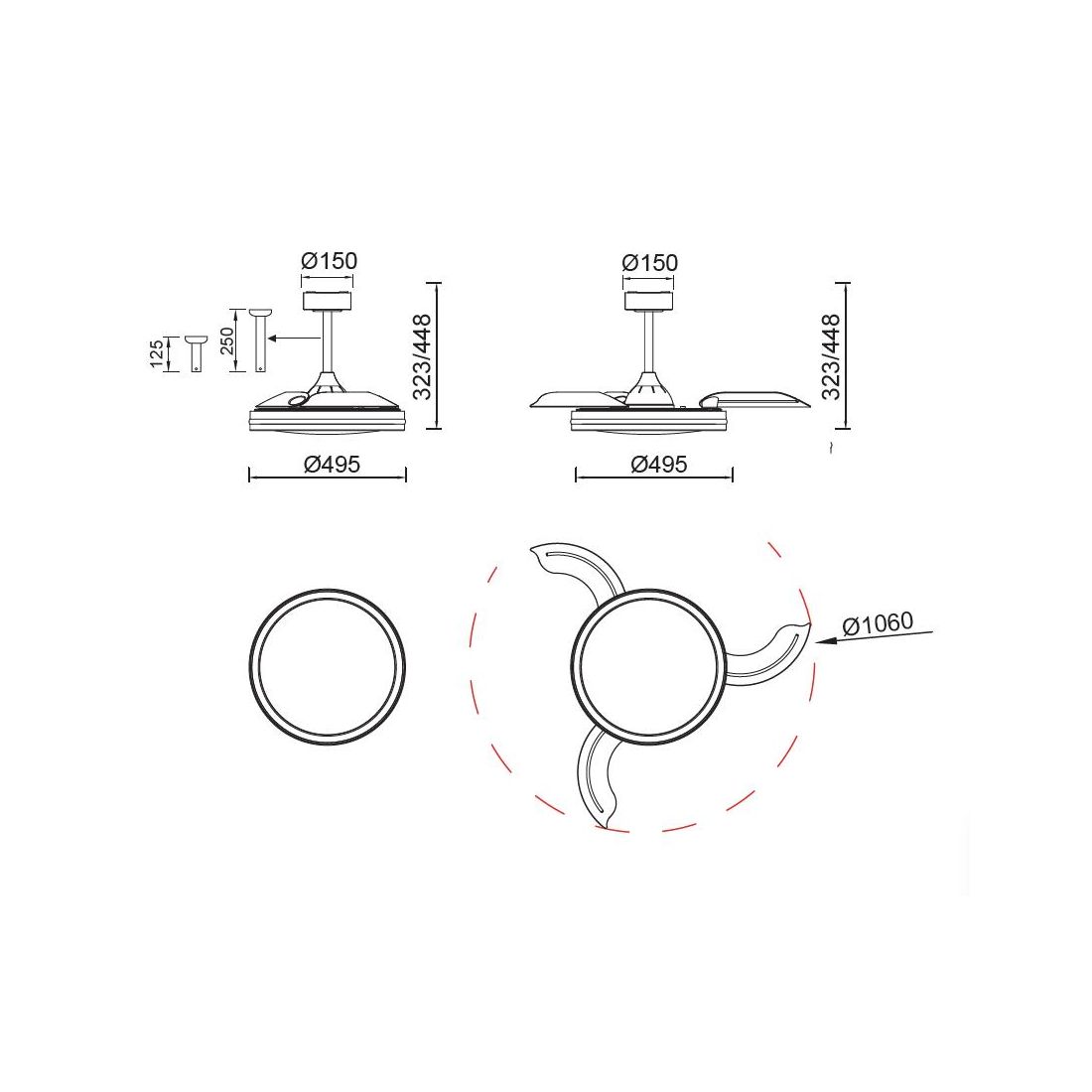 Tutte le funzionalità, accensione, regolazione della luce, selezione dei colori RGB, velocità della ventilazione sono gestibili in modo semplice e intuitivo tramite telecomando incluso nella confezione. Inoltre, per adattarsi a differenti altezze di soffitto, il ventilatore è fornito con due aste di prolunga intercambiabili da 12,5 cm e 25 cm che permettono di installare l’apparecchio alla distanza desiderata dal soffitto migliorando sia la distribuzione della luce che quella dell’aria.
