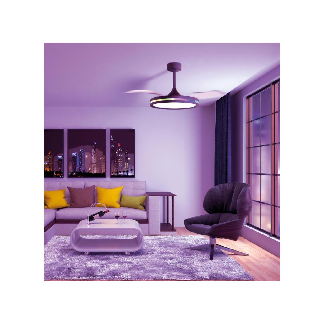 Il ventilatore è dotato di una sorgente luminosa a Led da 50W con intensità e temperatura colore regolabili, per adattarsi a ogni momento della giornata: da una luce bianca calda 3000K fino ad una luce fredda 6500K. A completare l’esperienza visiva, una sofisticata illuminazione RGB multicolore posizionata lungo il bordo esterno della struttura crea effetti cromatici scenografici ideali per valorizzare l’atmosfera della stanza o per aggiungere un tocco di originalità a cene, momenti di relax o intrattenimento.