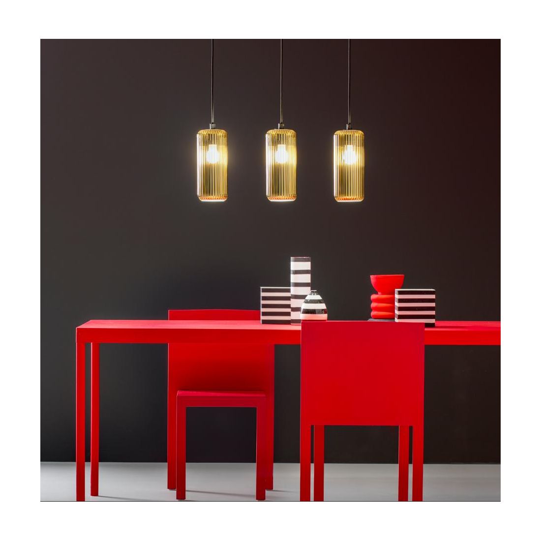 RAIKA SOSPENSIONE RETTANGOLARE CON DECENTRO 3 DIFFUSORI IN VETRO RIGATO COLORATO...