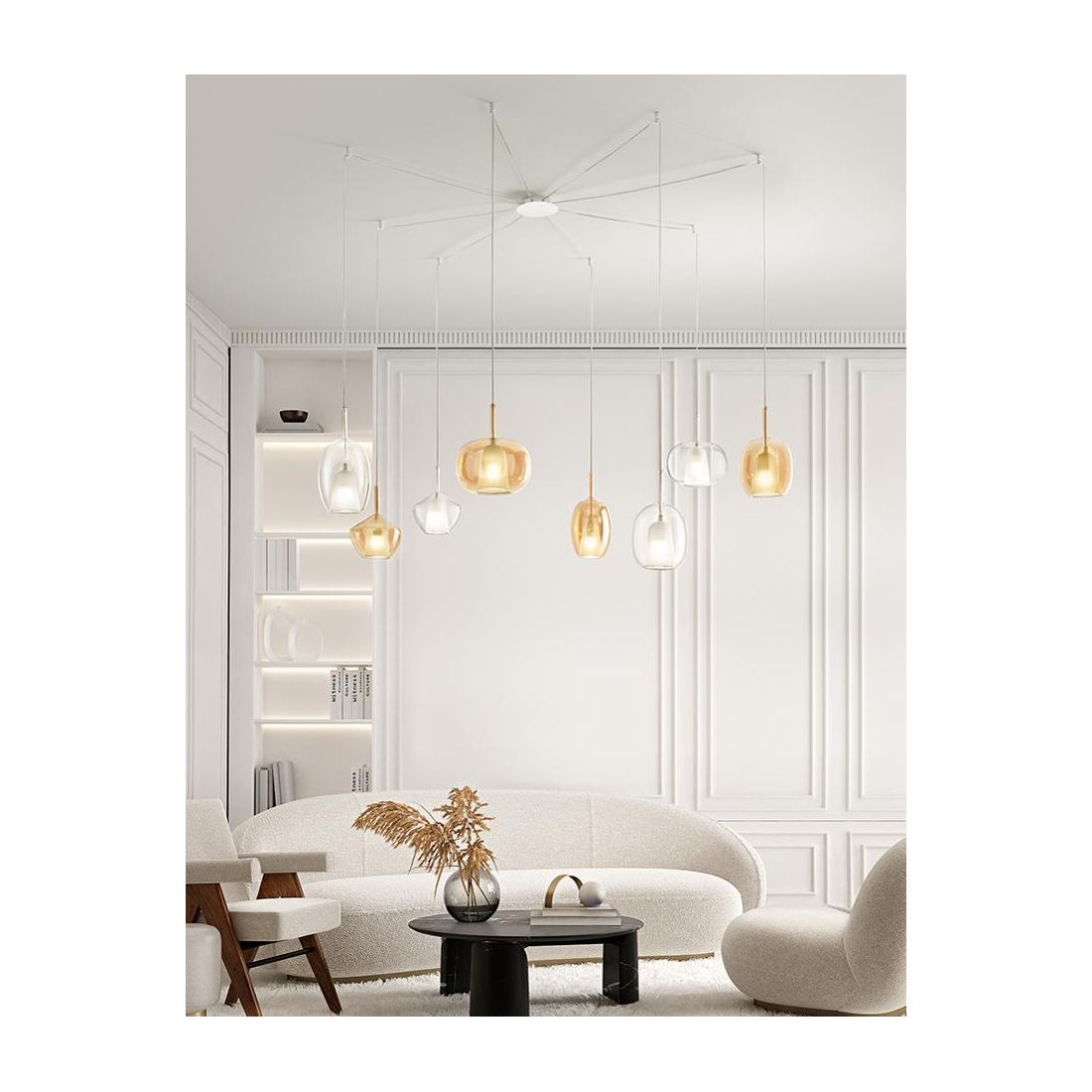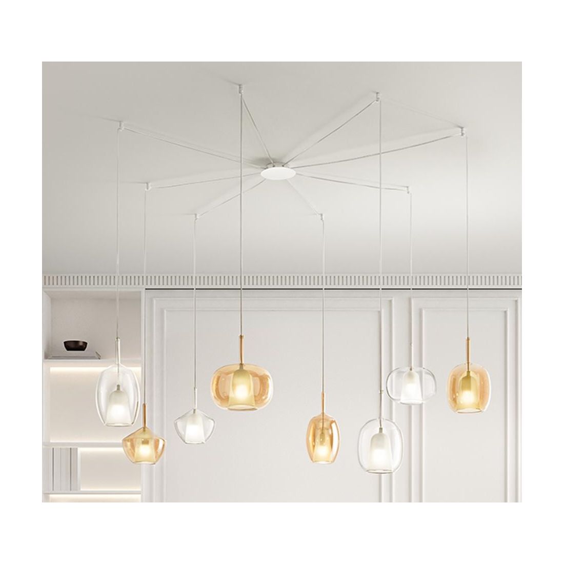 RAIN SOSPENSIONE ROTONDA 5 LUCI BASE CROMO CON DIFFUSORI IN VETRO TRASPARENTE, ORO E...