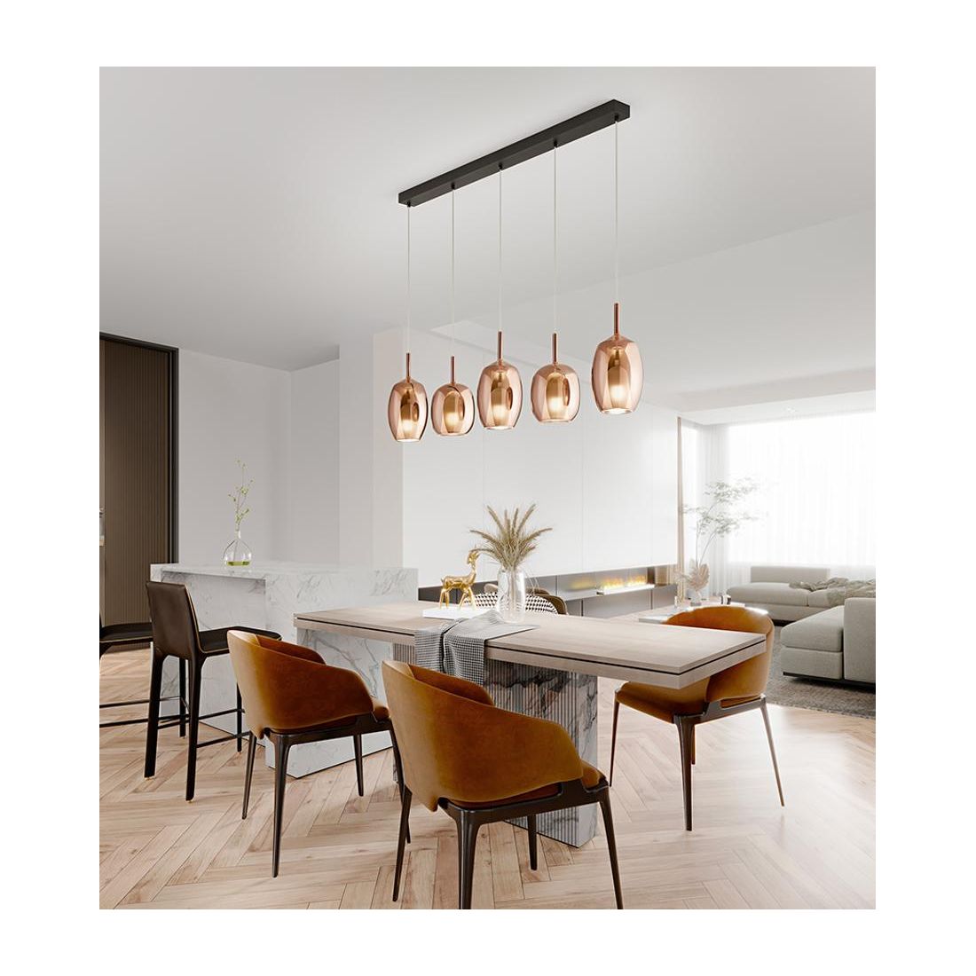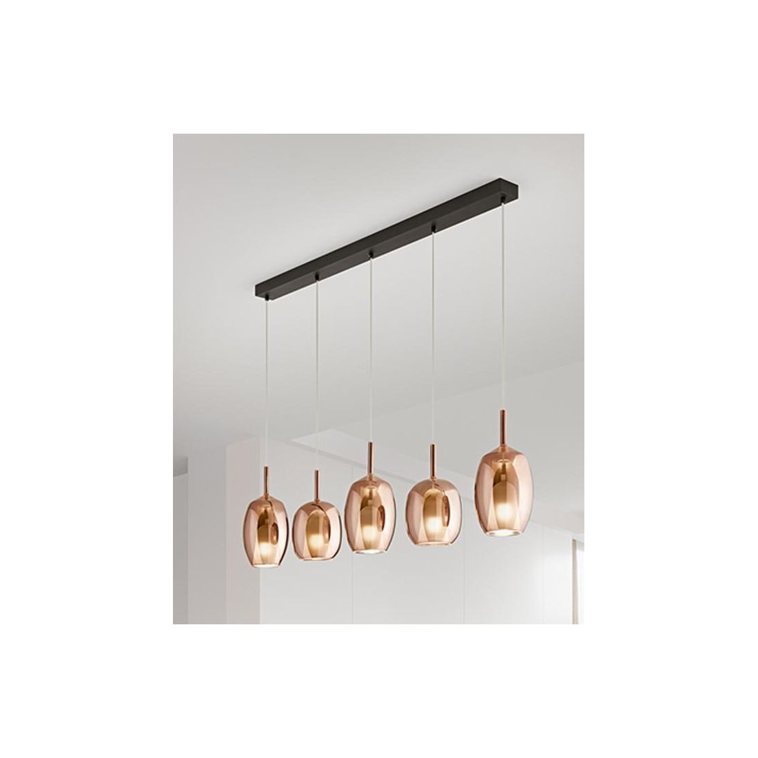 RAIN SOSPENSIONE LINEARE 5 LUCI BASE NERA CON DIFFUSORI IN VETRO TRASPARENTE DESIGN...