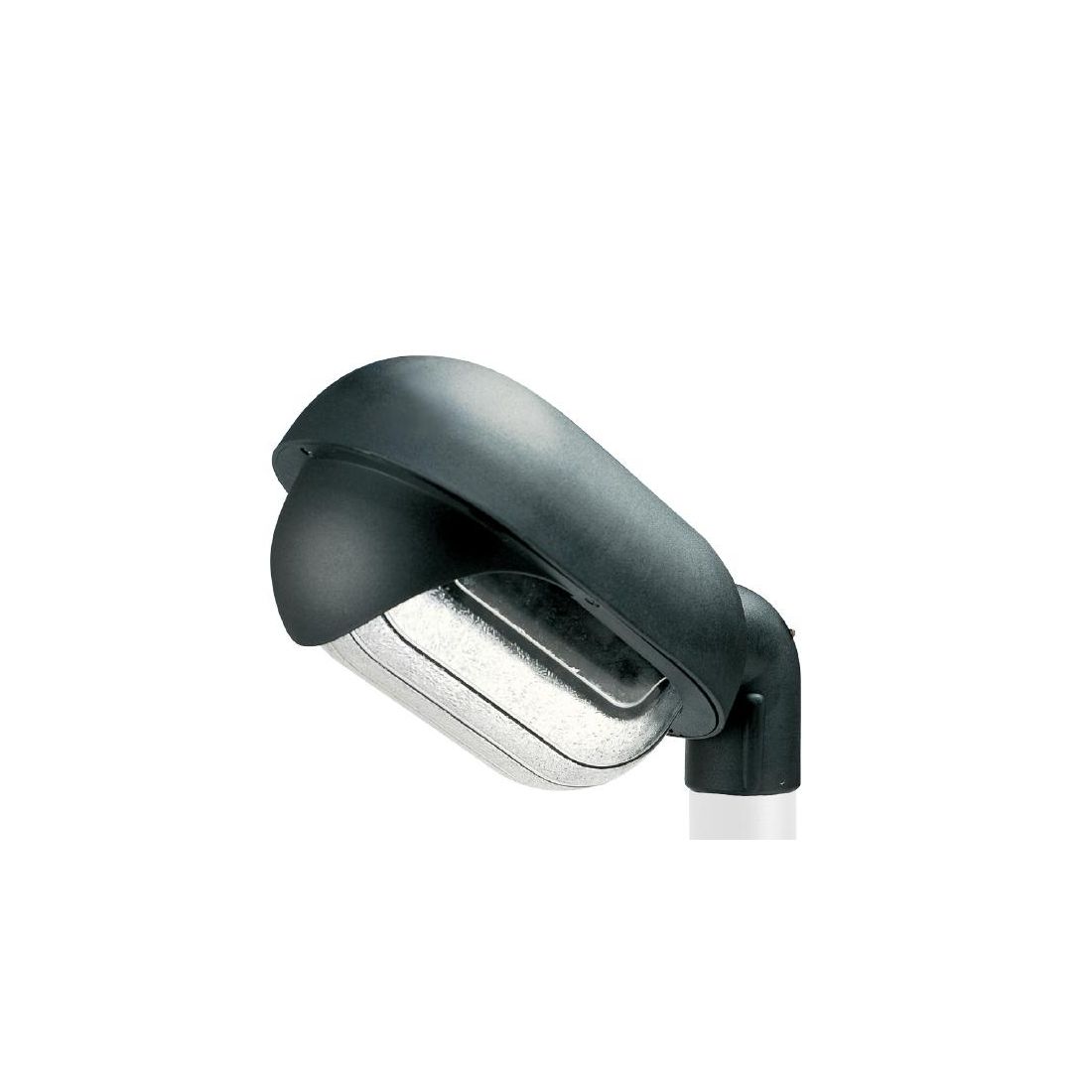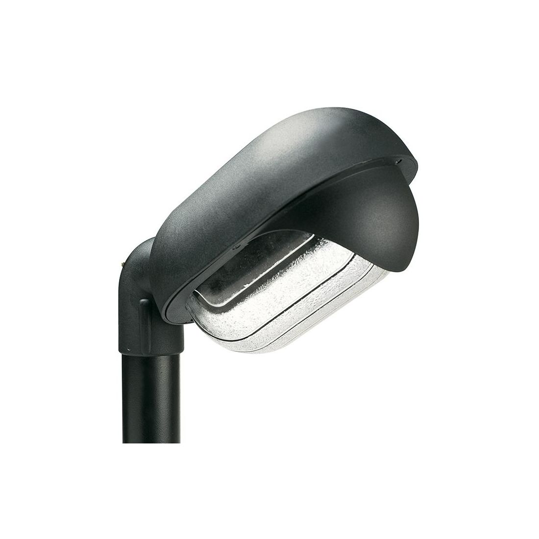 Testa-palo della serie RESIDENCE che si presenta con una struttura in materiale termoplastico di alta qualità di colore Nero e con il diffusore, di forma ovale, prodotto in vetro stampato trasparente rigato.