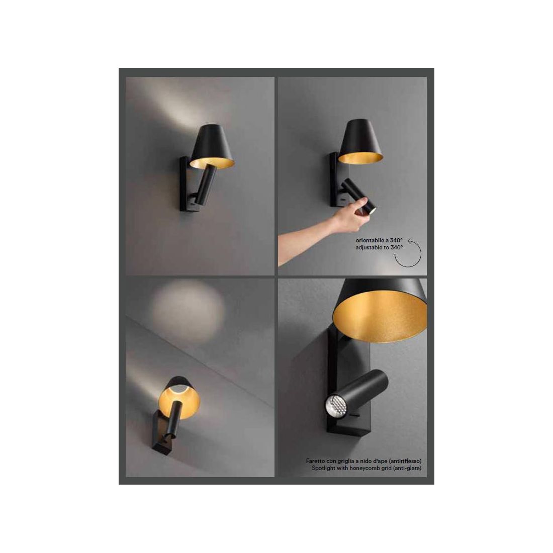 Un elemento distintivo di questa lampada è il faretto integrato, interamente realizzato in alluminio, che può essere ruotato fino a 340°. Questa ampia mobilità consente di orientare il fascio luminoso là dove serve offrendo un'illuminazione diretta oppure riflessa sul paralume per un effetto più soffuso e decorativo. Il faretto è dotato di una griglia a nido d’ape antiabbagliamento che riduce la dispersione della luce e migliora il comfort visivo rendendolo ideale per la lettura, lo studio o il lavoro al computer.
