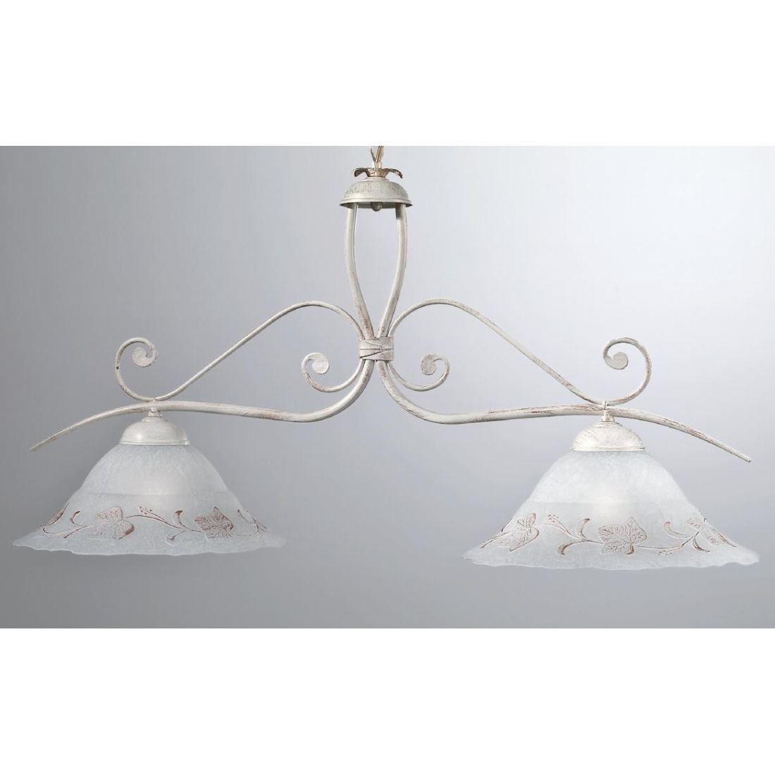 Bilanciere a 2 luci dallo stile rustico con la struttura realizzata in metallo con finitura color Avorio antico sfumato, con riccioli decorativi, e con i due diffusori prodotti in vetro satinato con decoro foglia edera marrone.