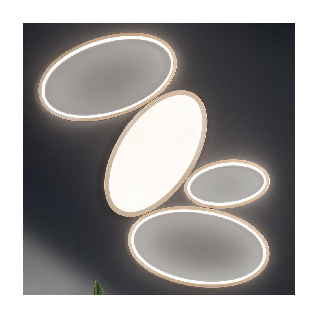 In uno degli anelli più grandi è prevista una luce supplementare schermata che emana una luce diffusa nell'ambiente mentre le altre strip led sono poste all'interno degli anelli per una luce soffusa.