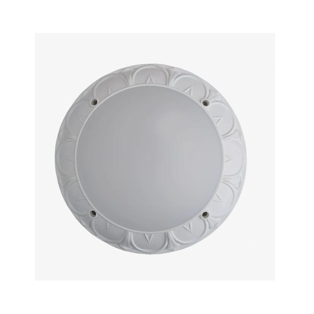 Rita è una plafoniera/applique di forma rotonda con una cover incisa a fiore, di diametro cm 35.5, realizzata in resina antiurto stabilizzata ai raggi UV inattaccabile da ruggine e corrosione; adatta soprattutto per le zone di mare dove la salsedine non riesce ad attaccarla nella sua integrità e nel colore.
